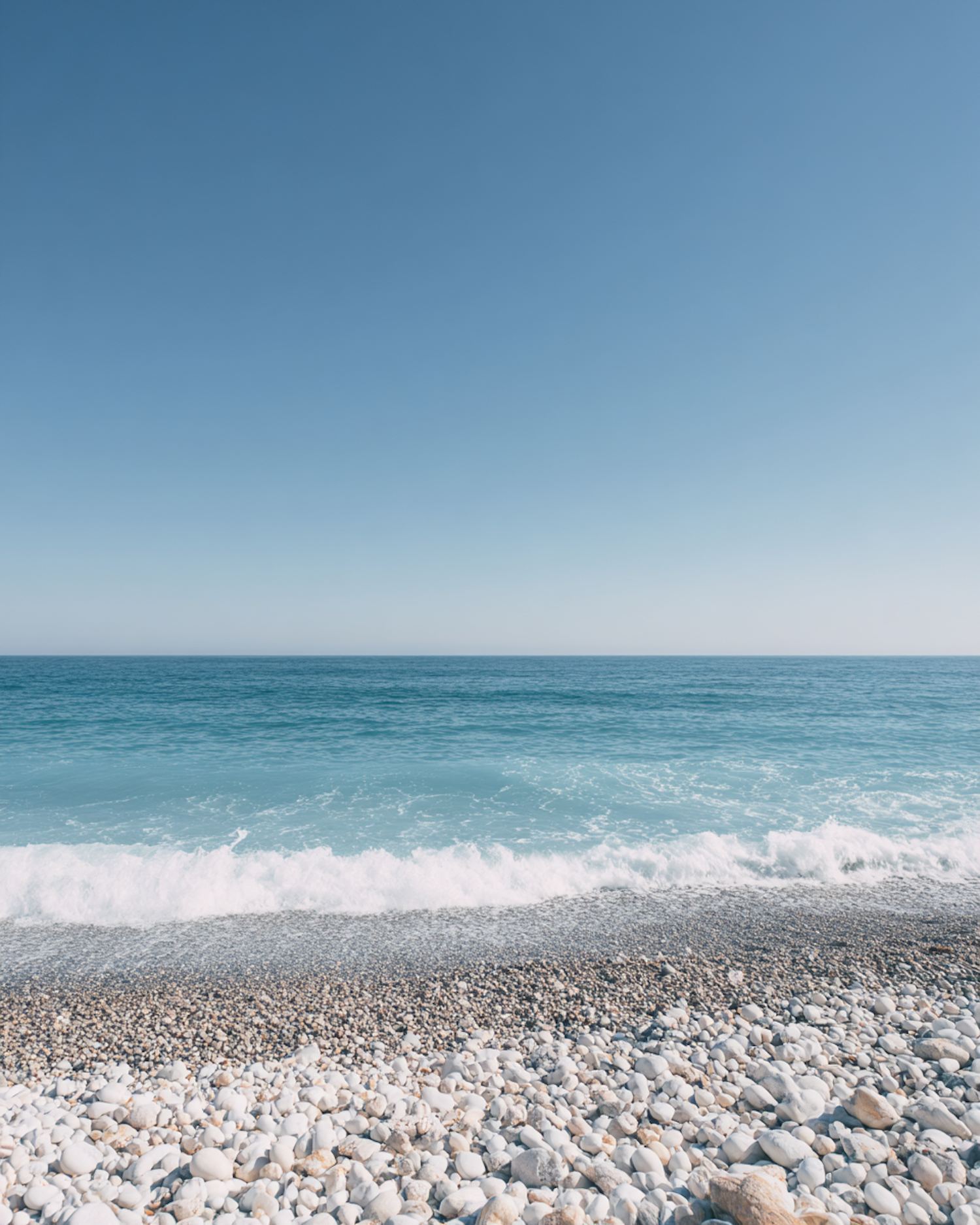 A tranquil pebble beach with gentle waves meeting the shore under a clear blue sky, perfect for a peaceful seaside escape.
