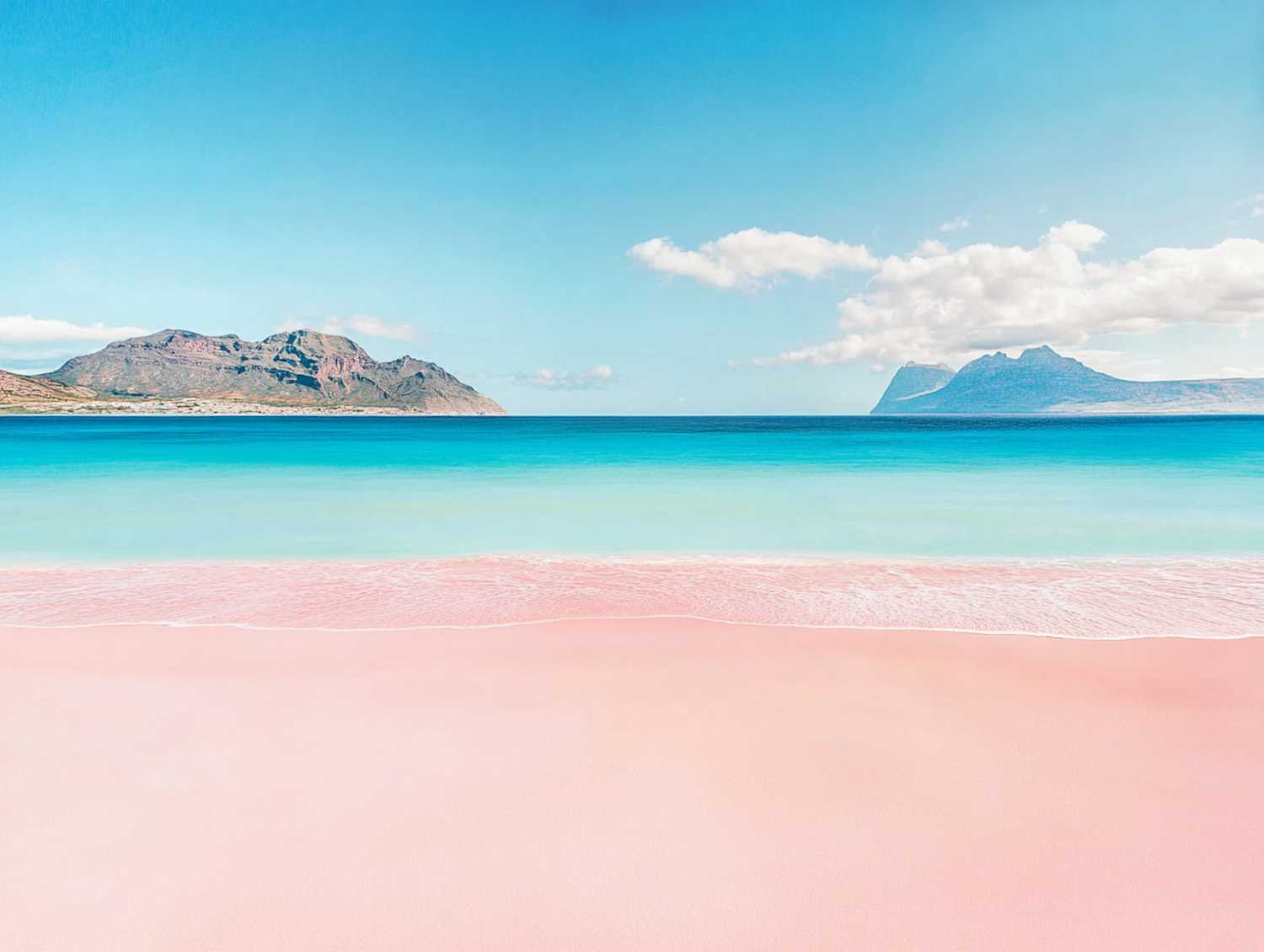 A stunning pink sand beach with turquoise waters, distant mountains, and a clear blue sky. Perfect for a serene and picturesque getaway.