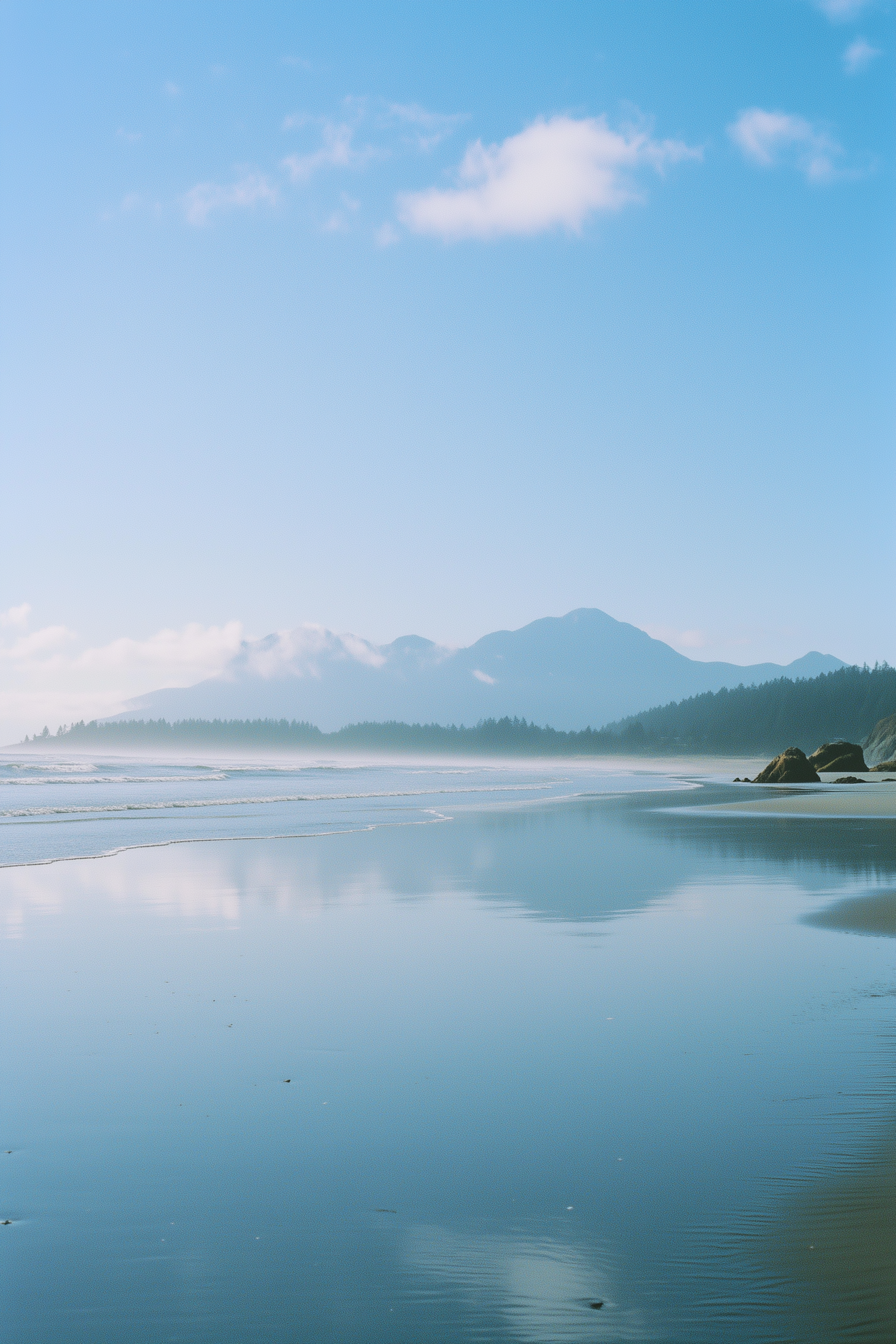 A tranquil beach with reflective waters, misty mountains, and scattered rocks under a soft blue sky with light clouds.