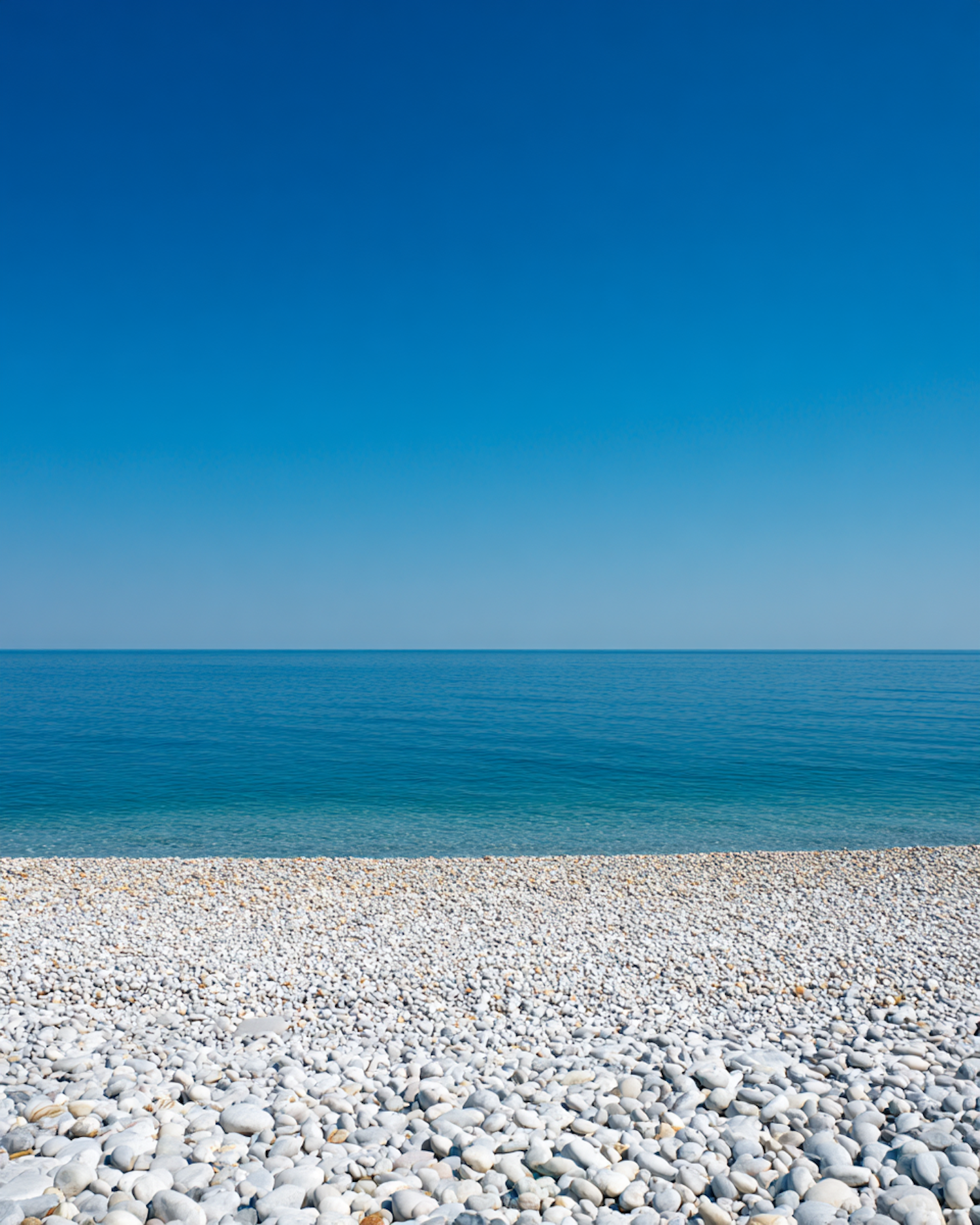 A tranquil pebble beach with smooth white stones, calm blue sea, and a clear sky, perfect for a serene coastal escape.