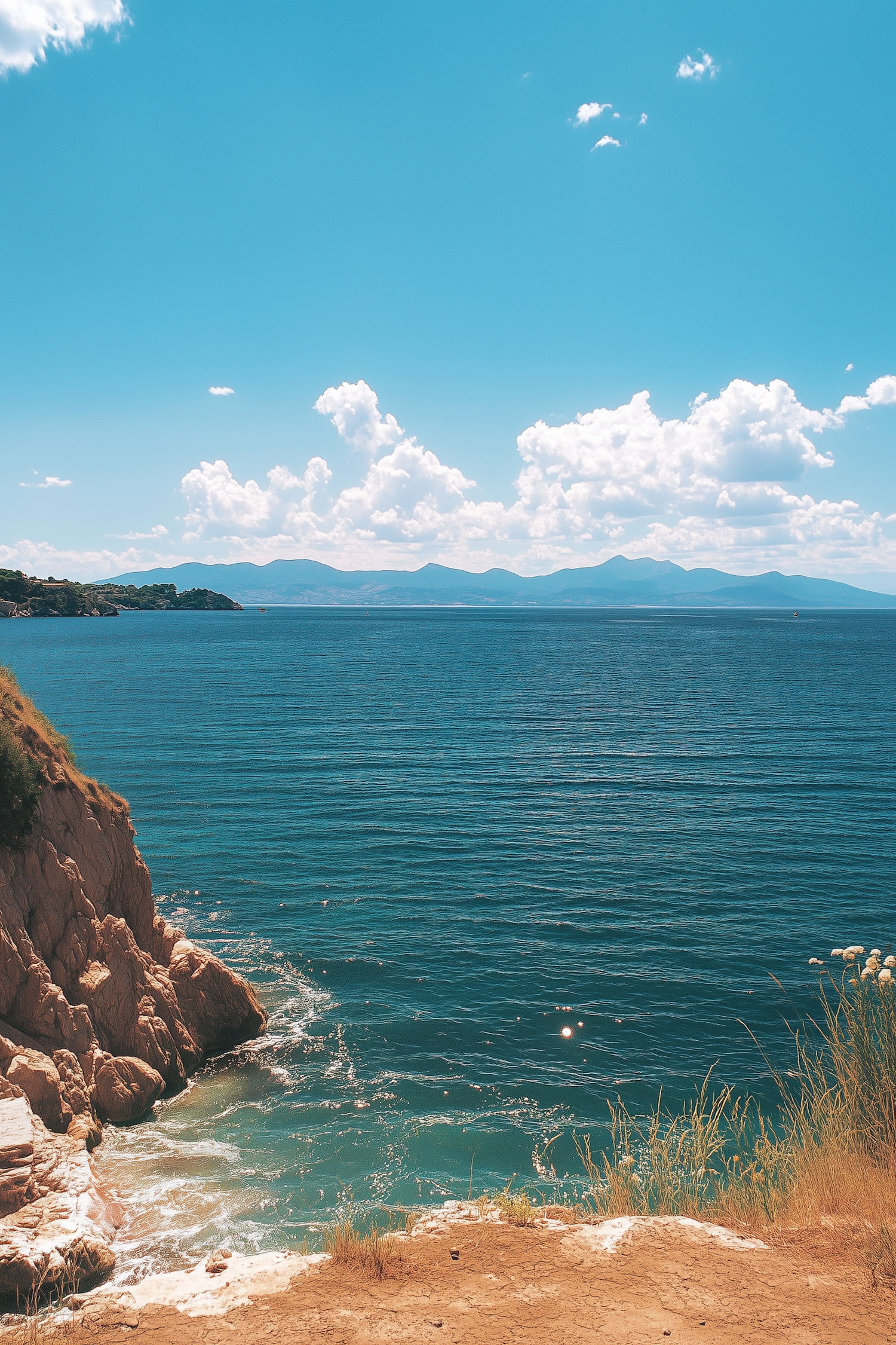 Breathtaking coastal view with turquoise waters, rocky cliffs, and distant mountains under a bright blue sky with fluffy clouds.