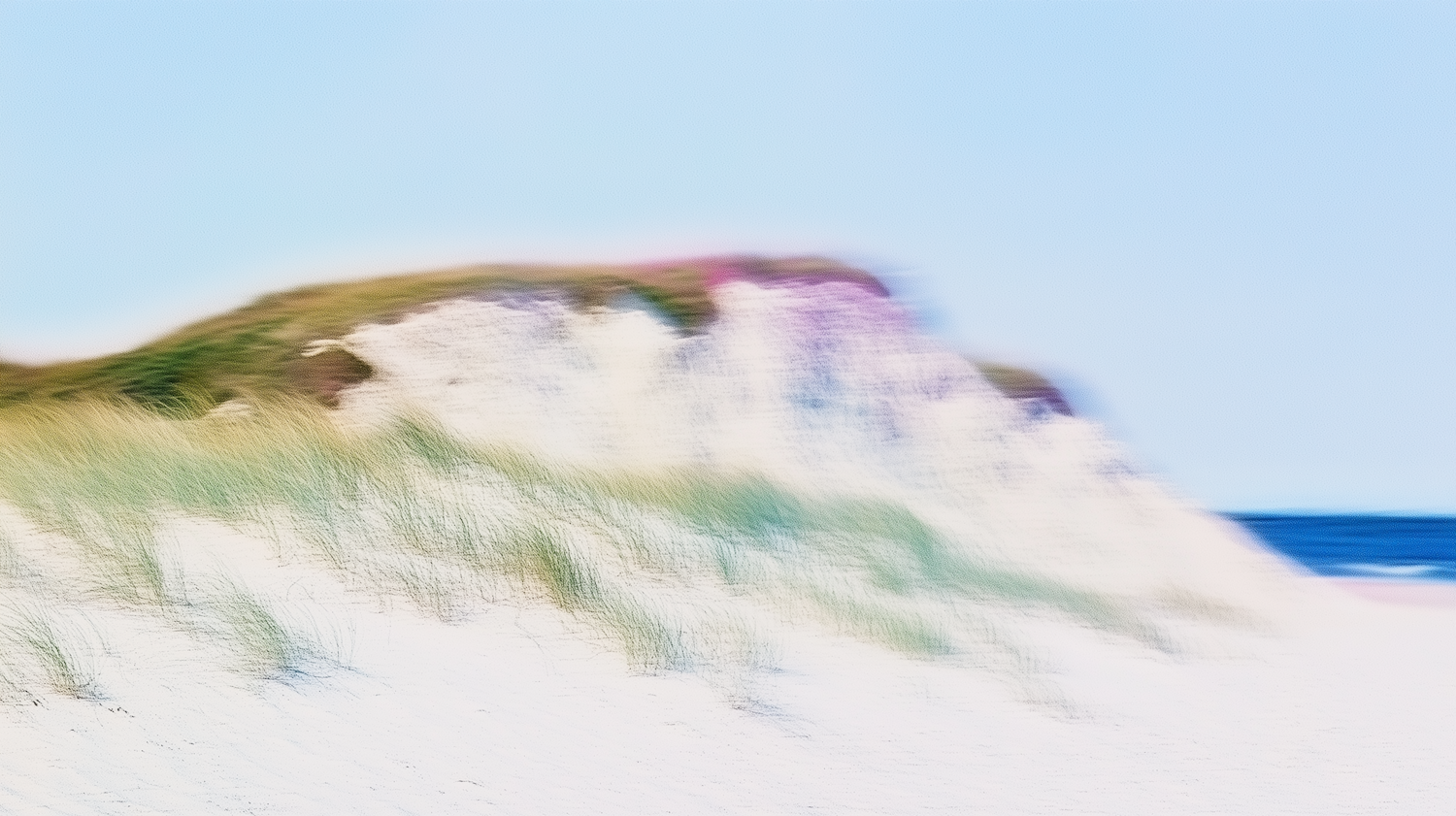 Dreamy coastal dunes with soft grass, white sand, and a calm blue ocean under a pastel sky. Perfect for serene and artistic vibes.