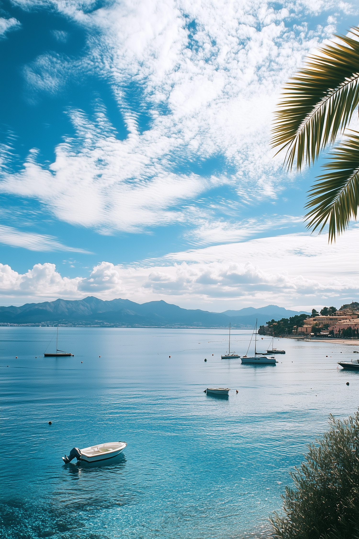 Tranquil coastal view with clear blue waters, anchored boats, distant mountains, and palm trees under a bright, cloud-dotted sky.
