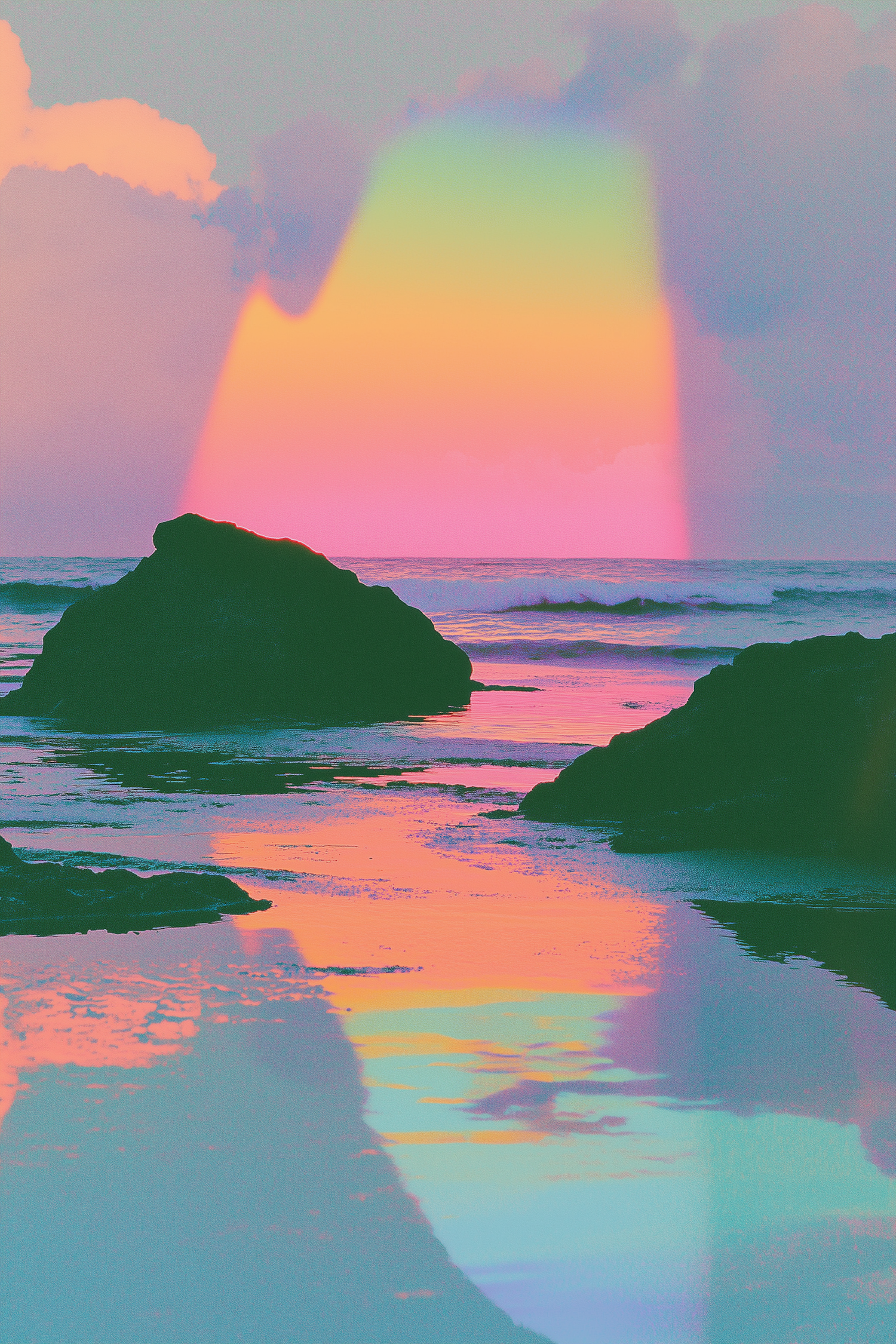 Surreal coastal scene with vibrant sky and rainbow reflections on water, featuring dark rock formations and a dreamlike atmosphere.
