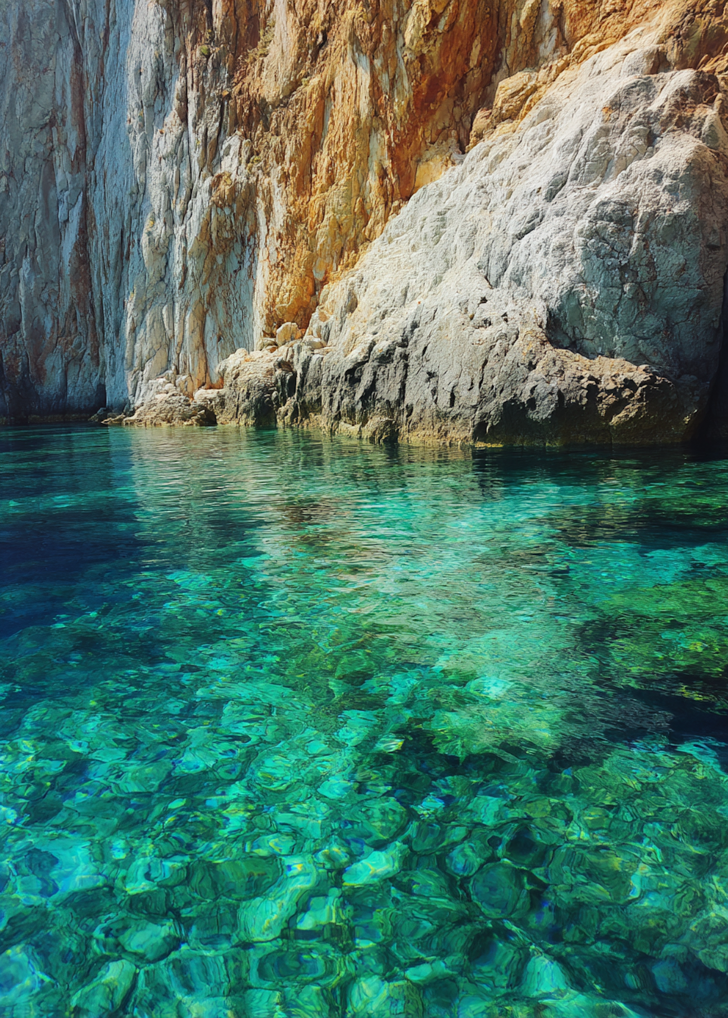 Crystal-clear turquoise waters meet rugged orange and white cliffs, creating a stunning coastal view perfect for nature lovers.