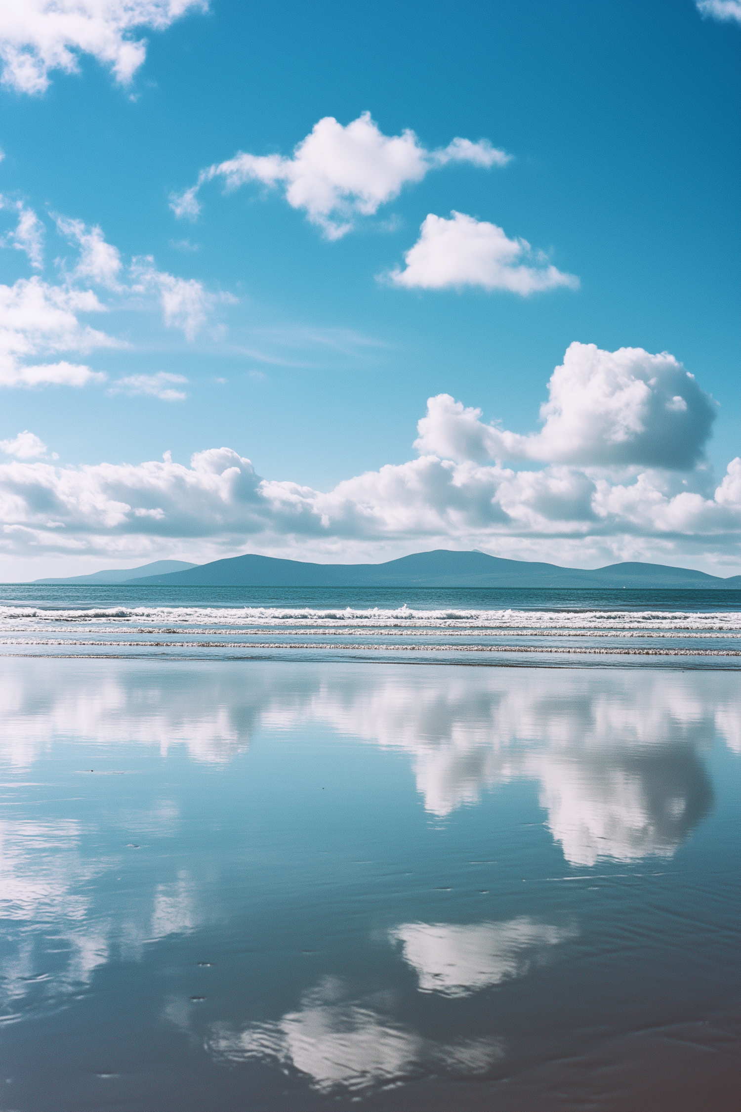 A tranquil beach scene with wet sand reflecting fluffy clouds, gentle waves, and distant green hills under a vibrant blue sky.