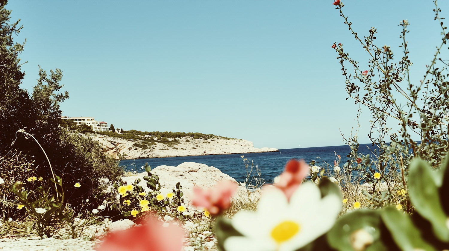 A tranquil coastal view with wildflowers in the foreground, a rocky shoreline, and a calm blue sea under a clear sky.