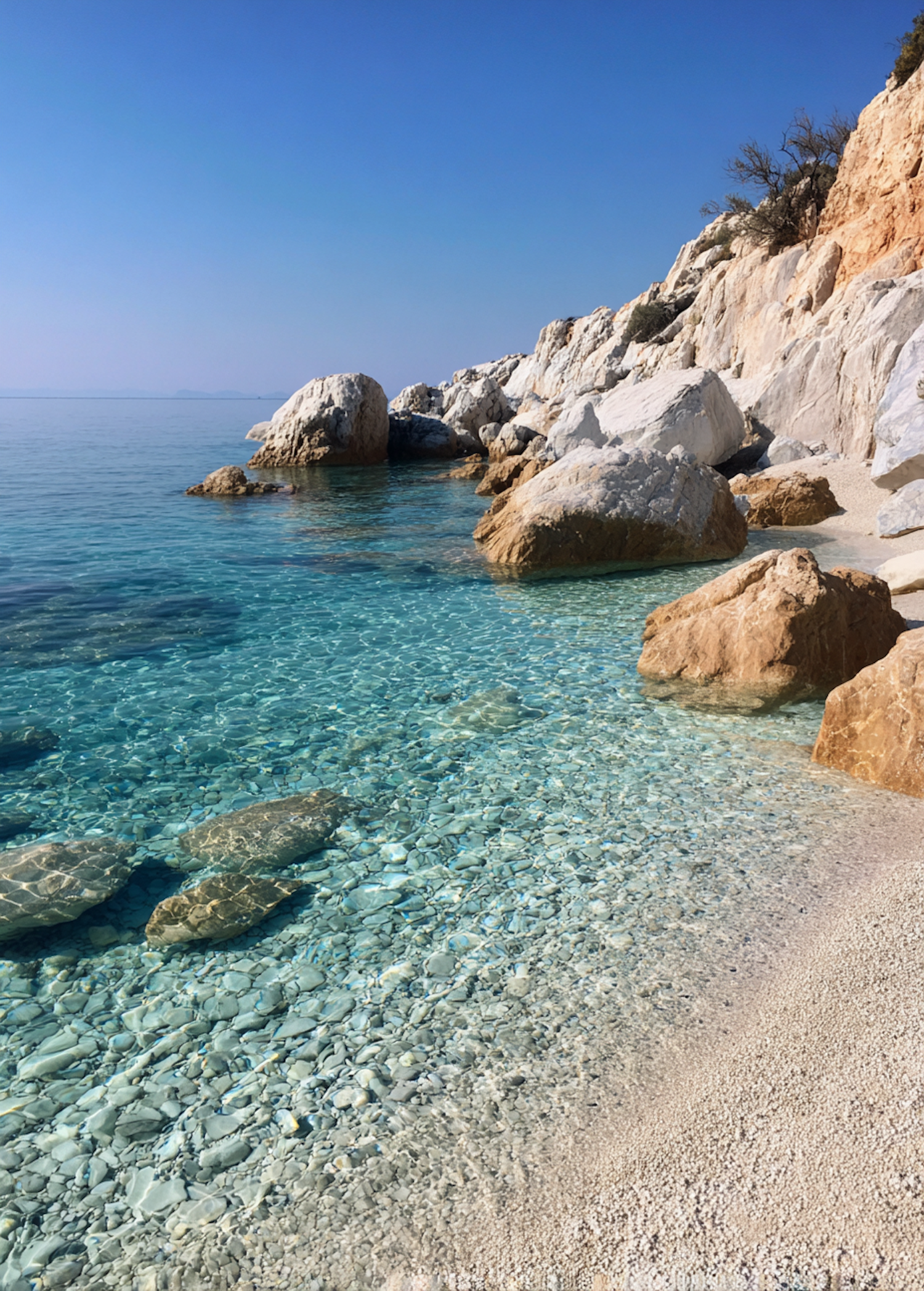 Crystal-clear turquoise waters meet a rocky shoreline with sunlit boulders and pebbles, creating a serene coastal escape.