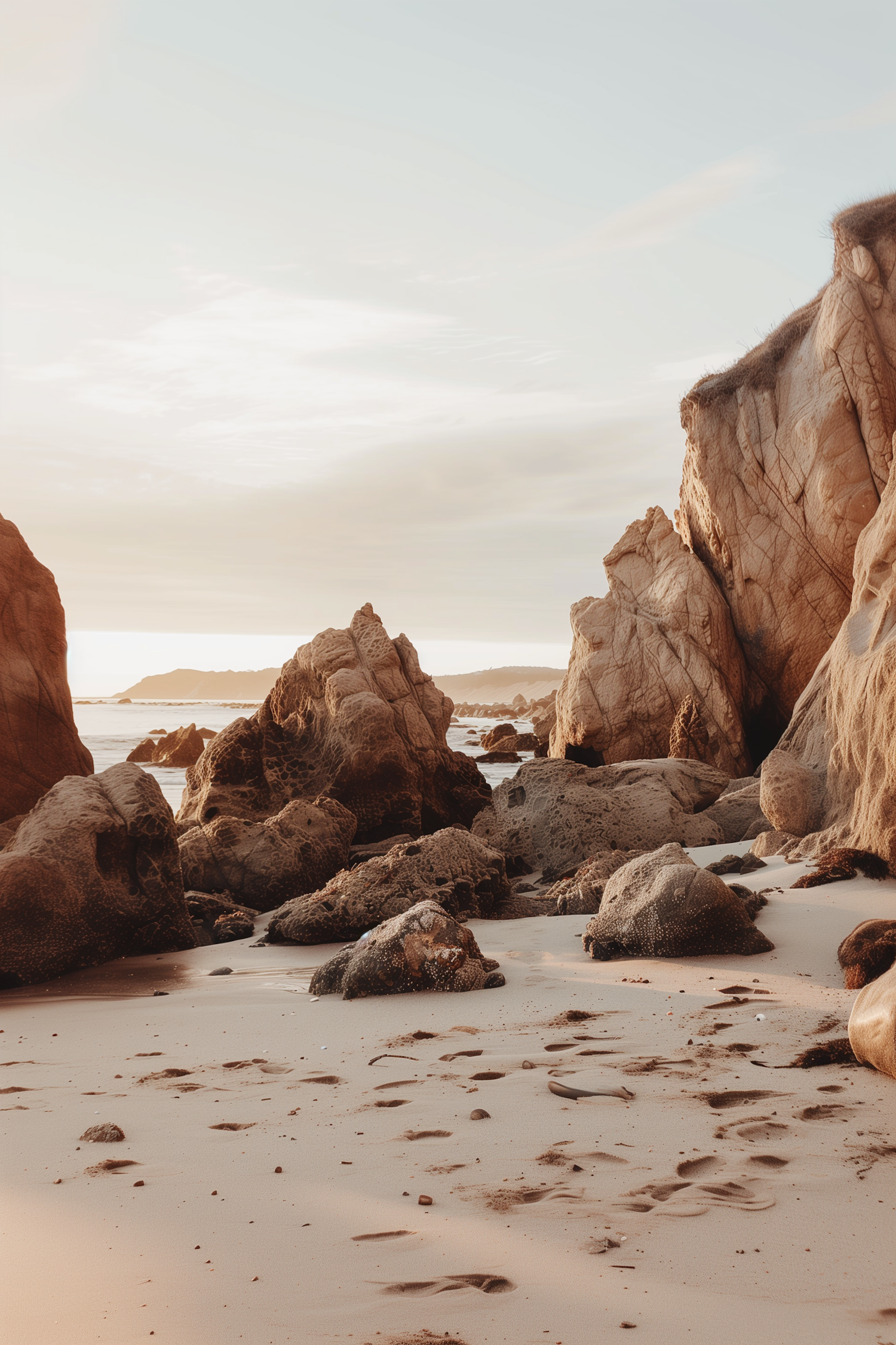 Tranquil beach scene with rugged rocks, smooth sand, and a serene ocean under a soft, golden sky.