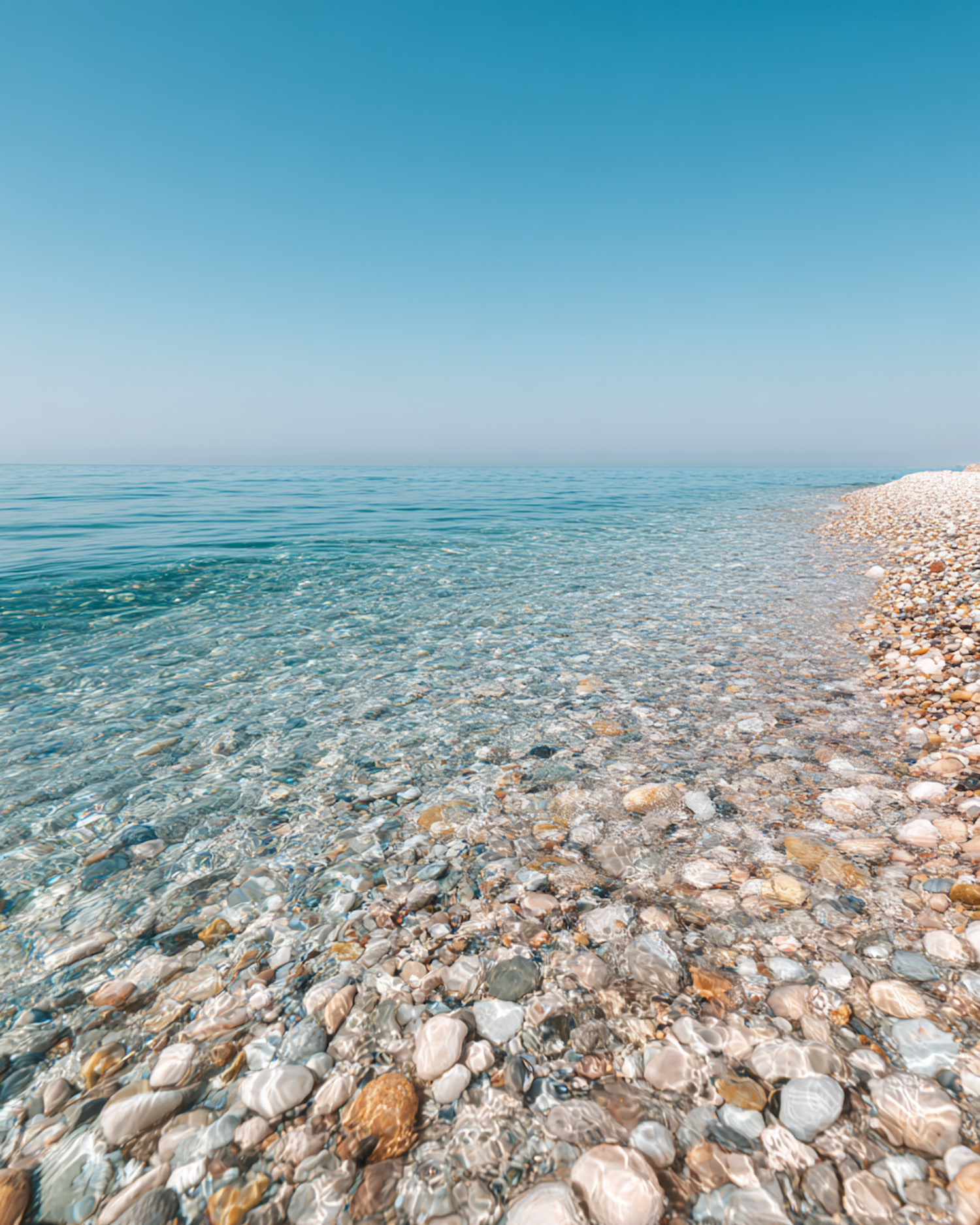 Crystal-clear water over a pebble beach under a bright blue sky, creating a serene and tranquil coastal scene.