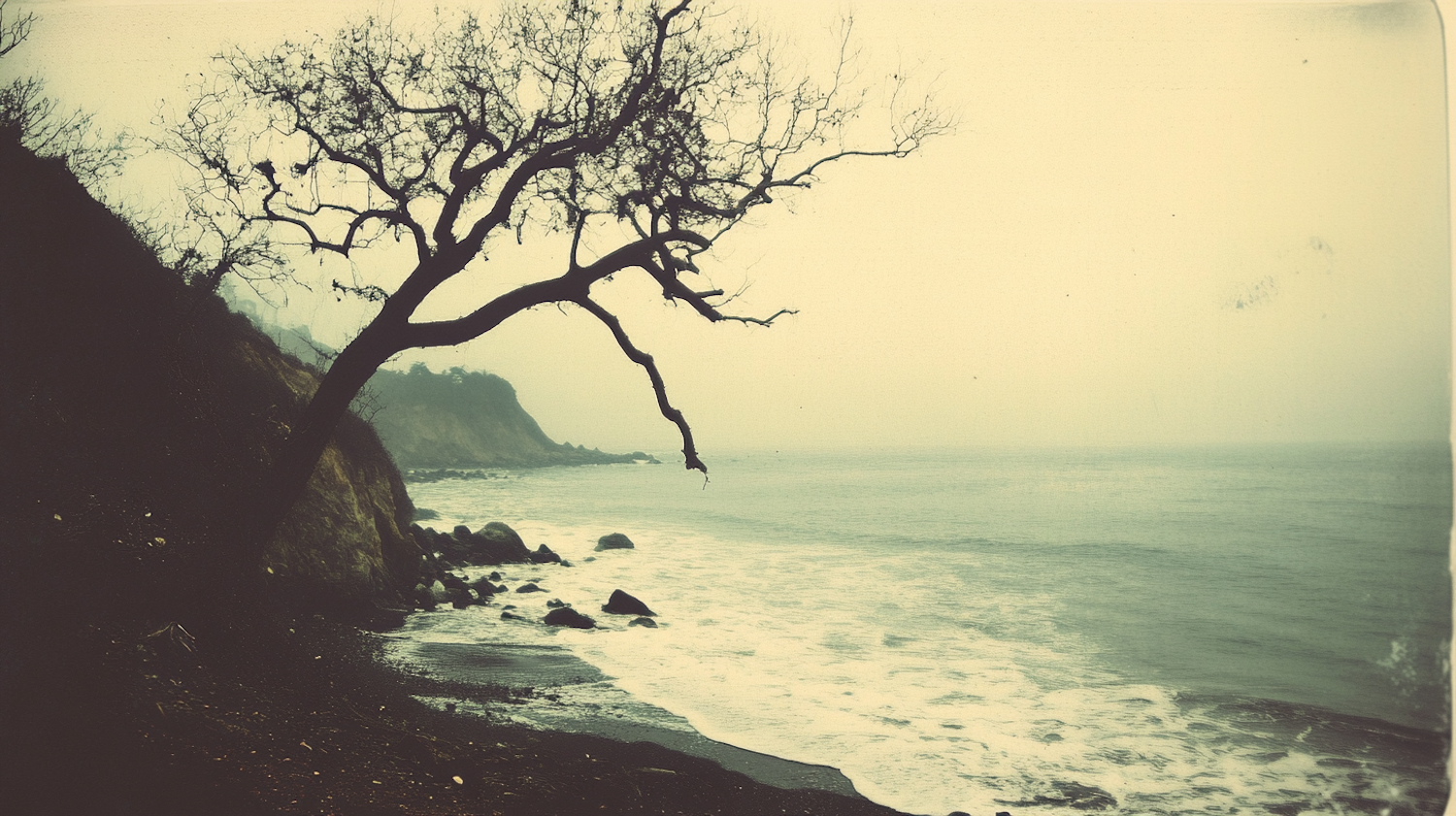 A solitary tree on a misty, rocky coastline with sepia tones, creating a nostalgic and serene atmosphere.