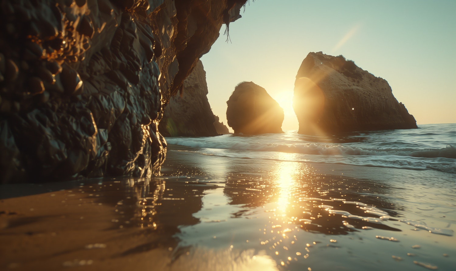 Sunset over a tranquil beach with stunning rock formations and golden reflections on the water.