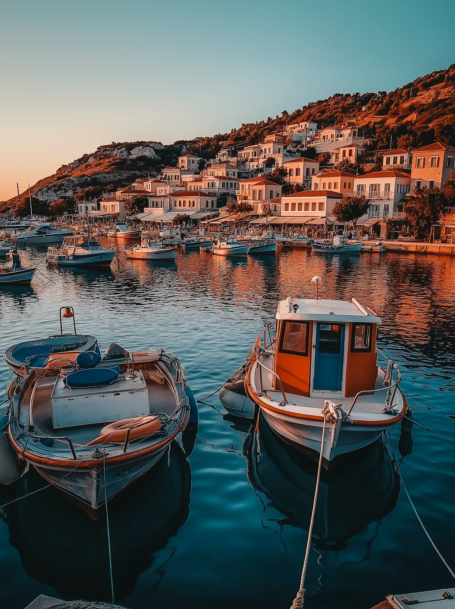 Charming harbor at sunset with boats and hillside village, warm hues reflecting on calm waters, creating a serene coastal scene.