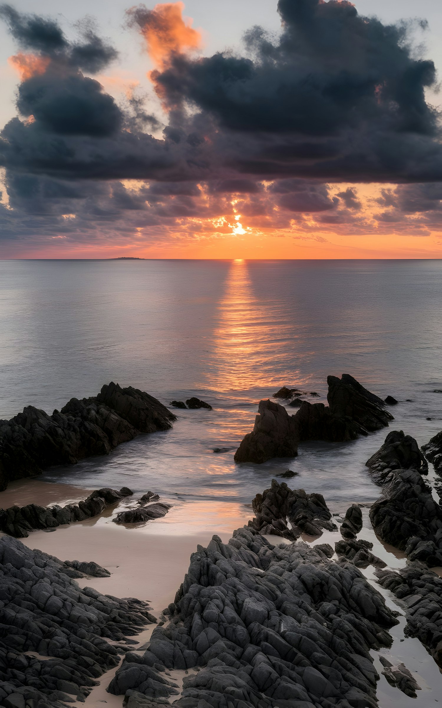 Breathtaking sunset over a rocky coastline, with dramatic clouds and golden reflections on the calm ocean waters.