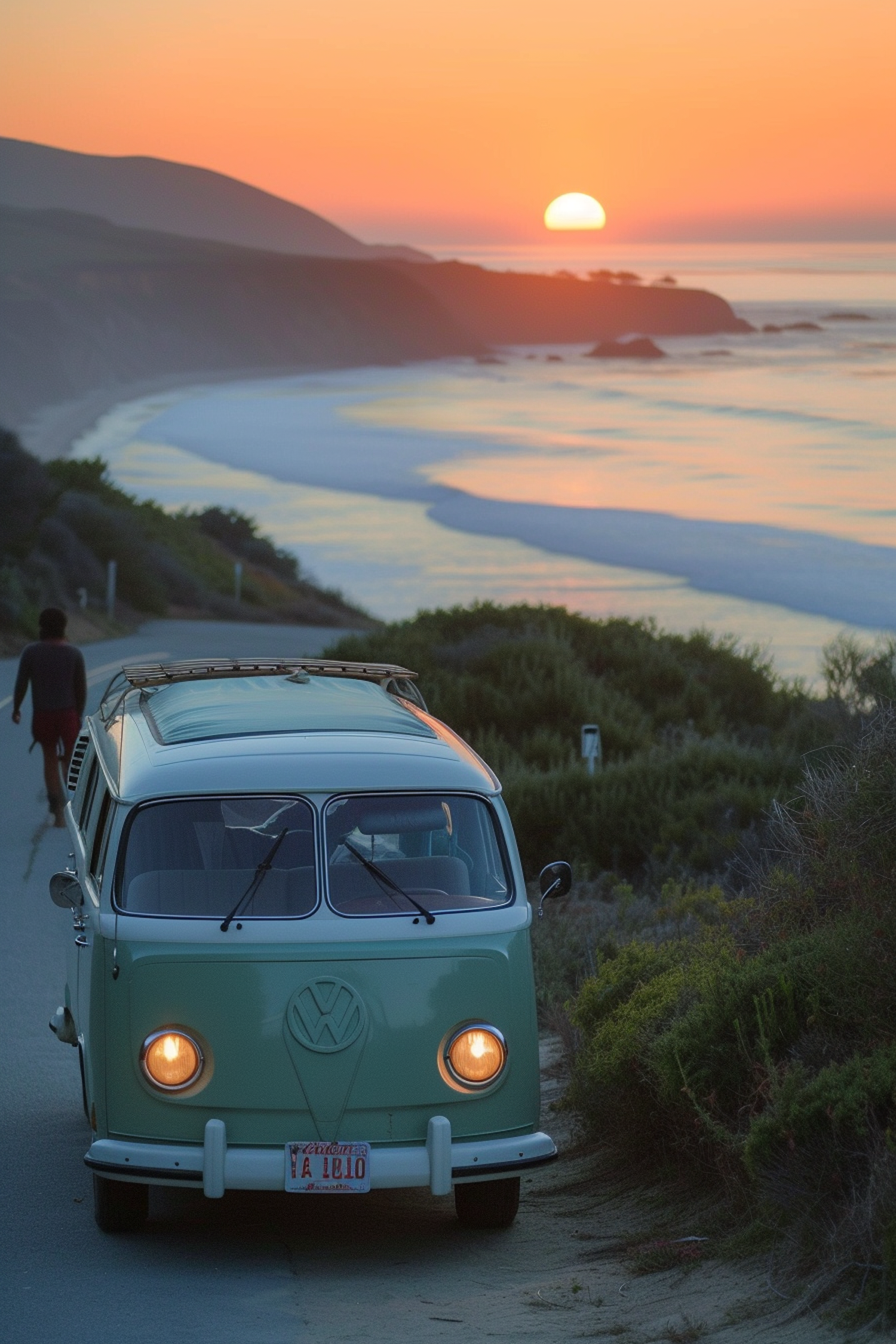 Vintage VW van on a coastal road at sunset, with a person walking towards the beach. Warm hues and ocean views create a serene atmosphere.