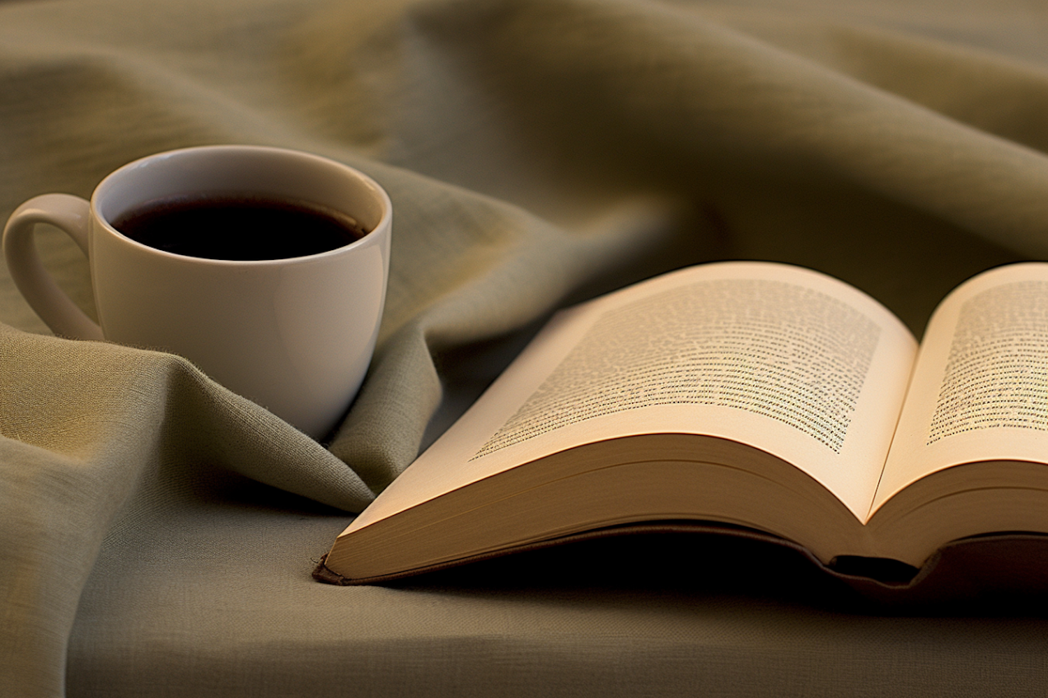 Cozy scene with a cup of coffee and an open book on soft olive-green fabric, creating a warm and inviting atmosphere.