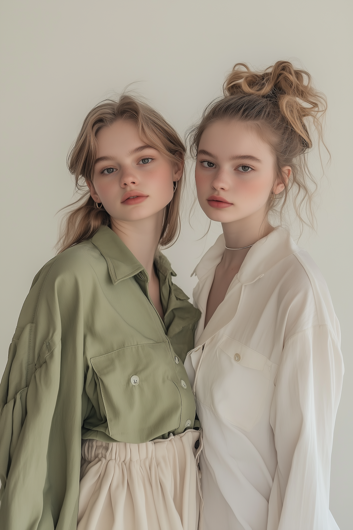 Two young women with fair skin and light hair pose together in stylish button-up shirts, exuding elegance and serenity.