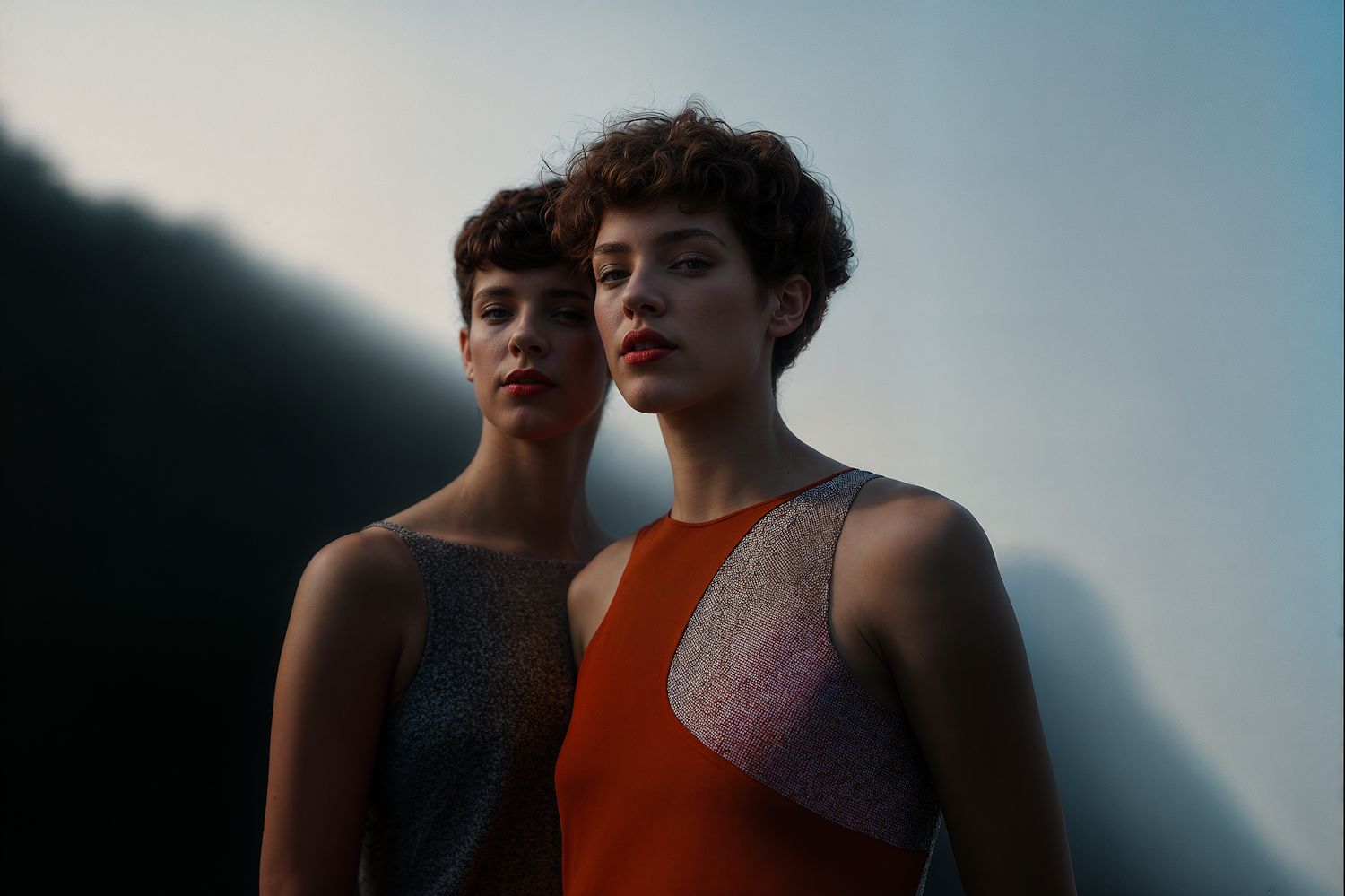 Two women with short curly hair in stylish dresses stand closely, set against a serene, softly blurred background.