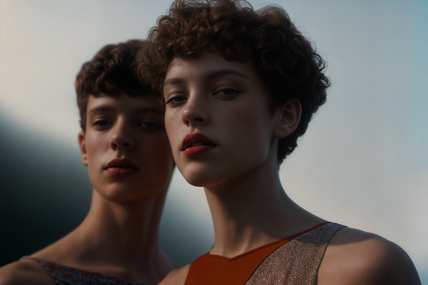 Two young women with short curly hair stand closely, illuminated by soft light, creating an intimate and serene atmosphere.
