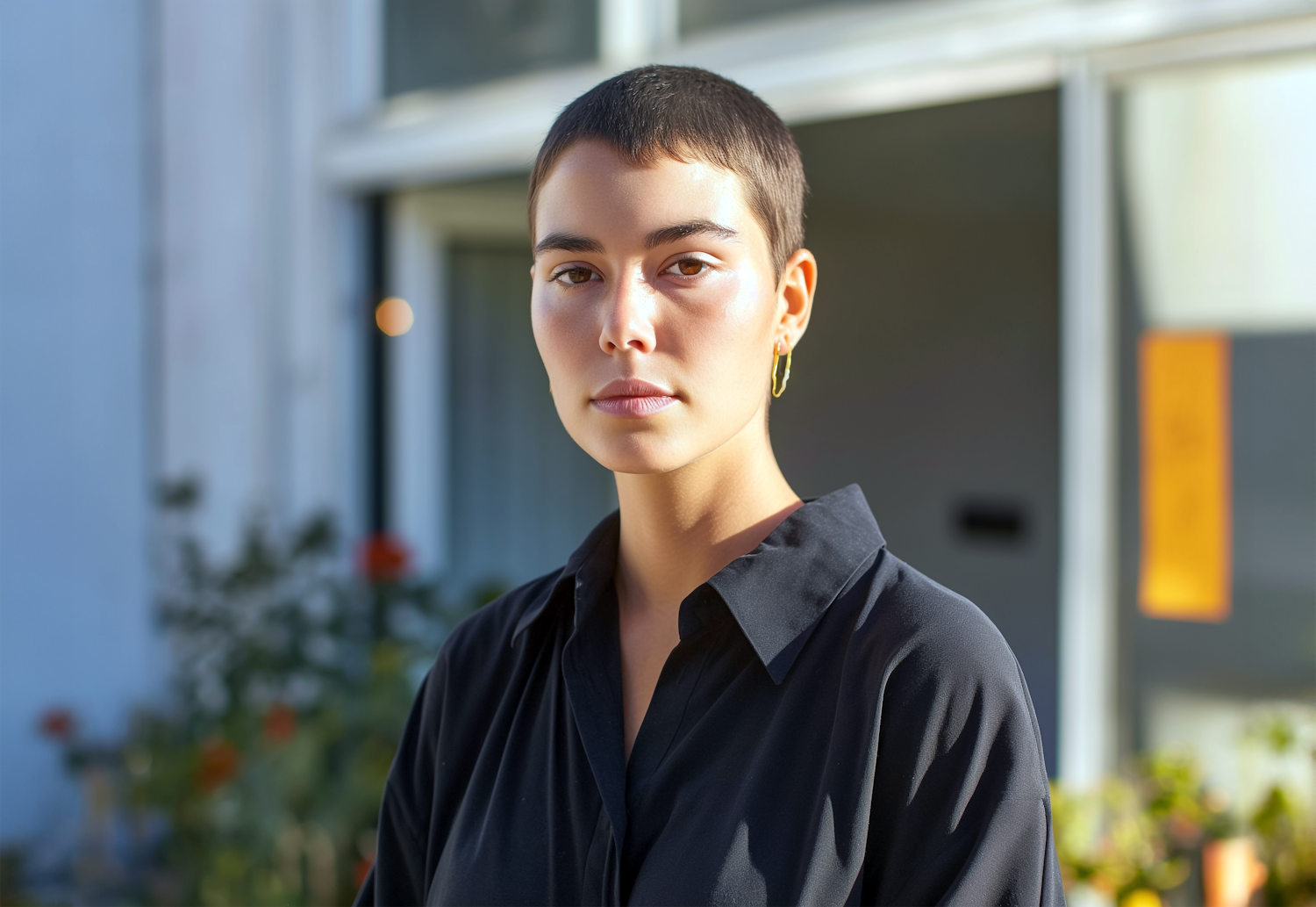 Young woman with short hair and gold hoop earrings in a black shirt, standing outdoors with a calm expression.