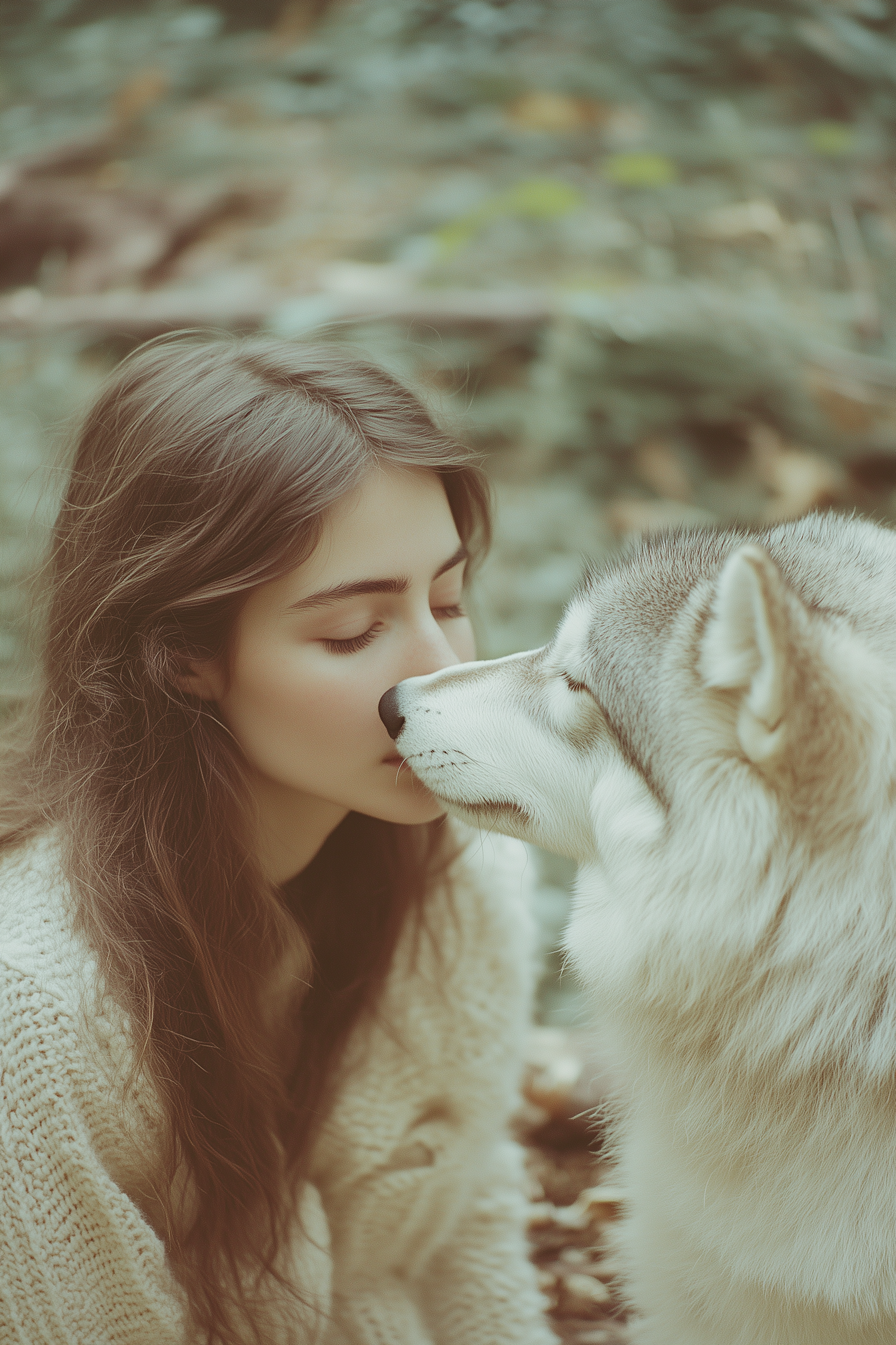 A serene moment between a woman and a Siberian Husky, sharing a gentle nose touch in a soft, blurred outdoor setting.