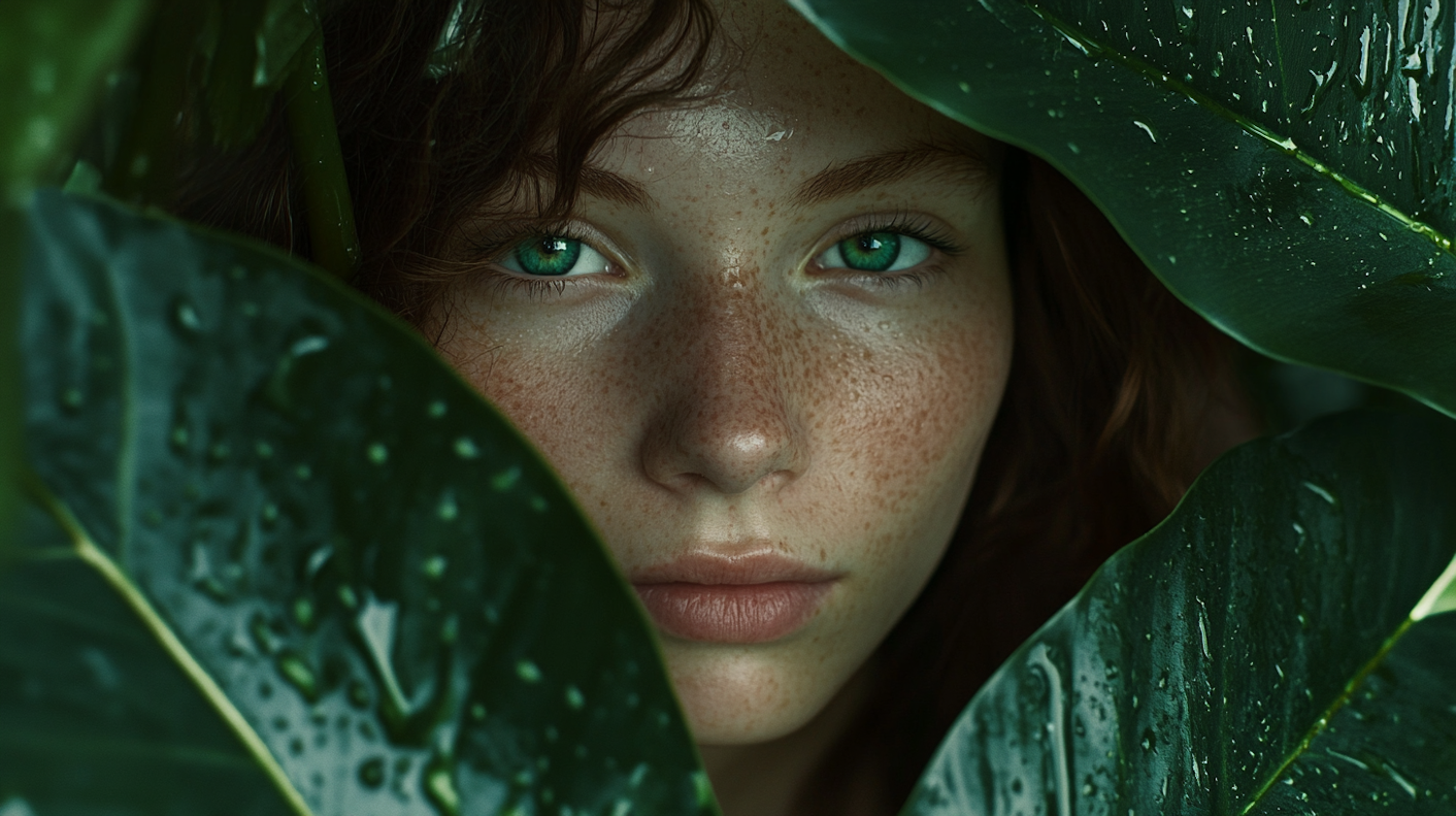 Close-up of a freckled woman with green eyes framed by lush, wet leaves, creating a captivating and natural portrait.