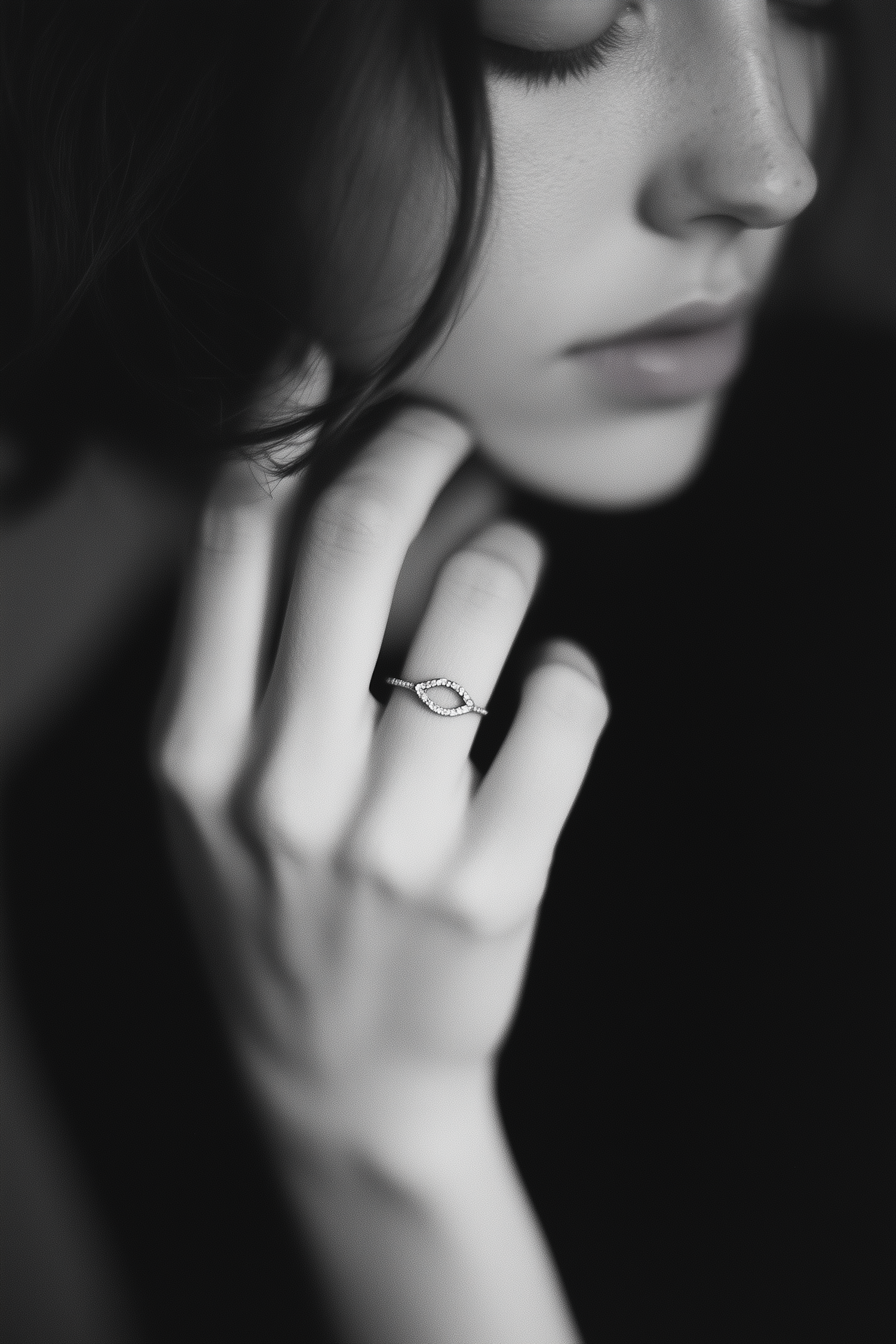 Black and white close-up of a woman with a delicate ring, showcasing elegance and serenity in a contemplative pose.