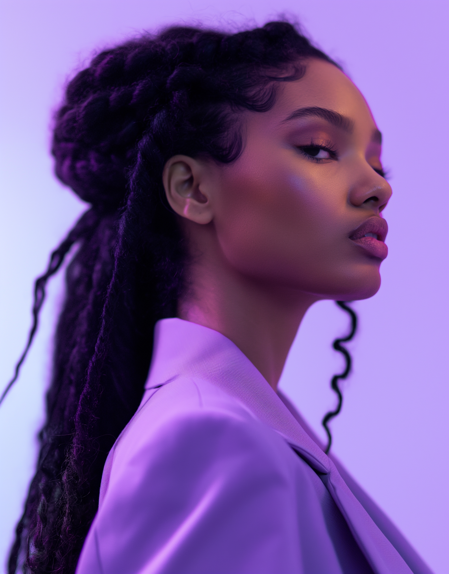 Elegant portrait of a woman in a lavender blazer with purple lighting, showcasing her confident expression and stylish updo.