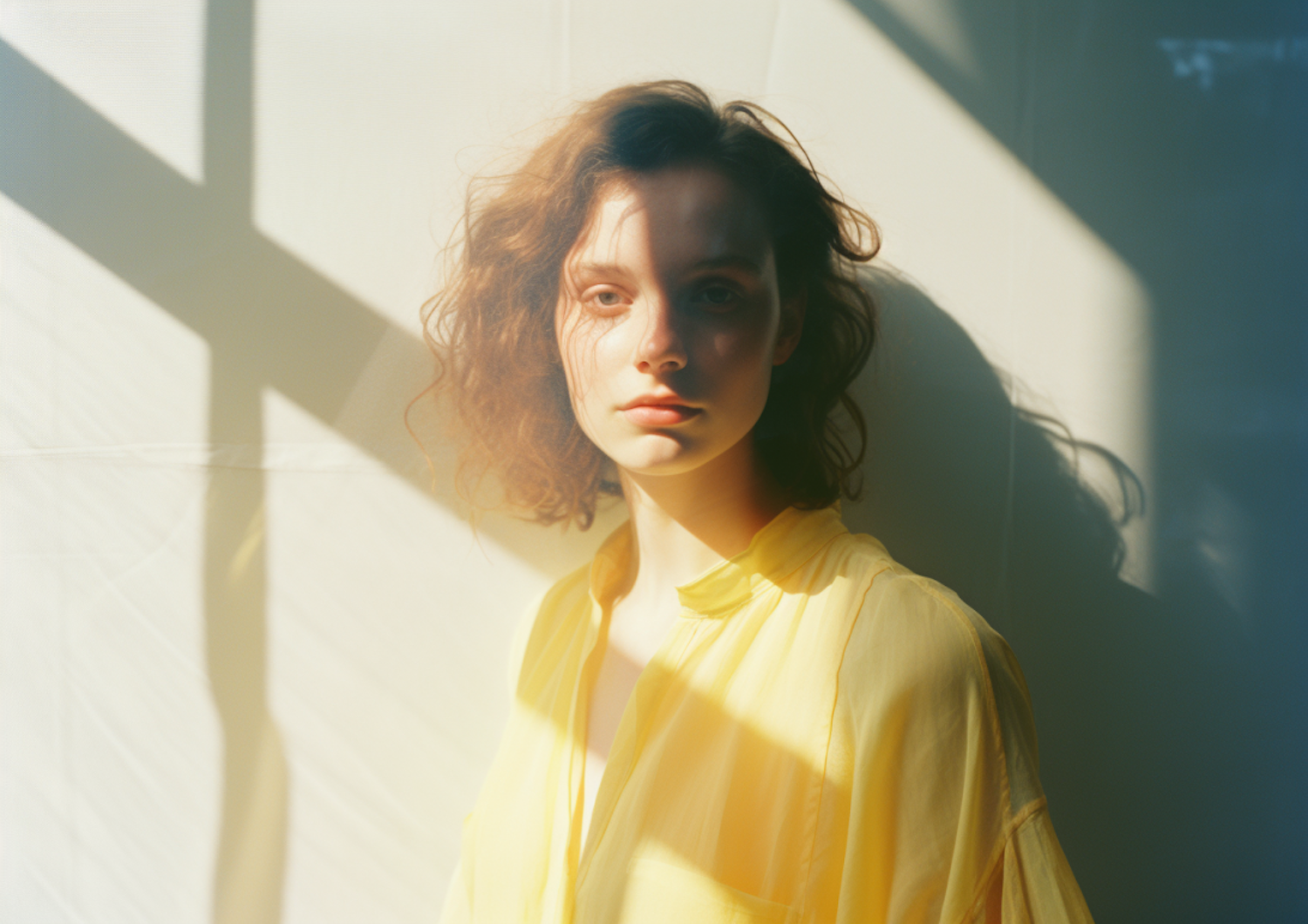 A serene portrait of a young woman in a yellow blouse, bathed in soft sunlight with dramatic shadows on a neutral background.