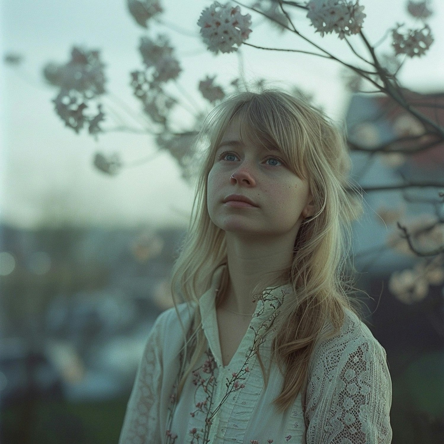 A serene young woman with blonde hair and blue eyes gazes upward, surrounded by delicate pink blossoms in a dreamy outdoor setting.