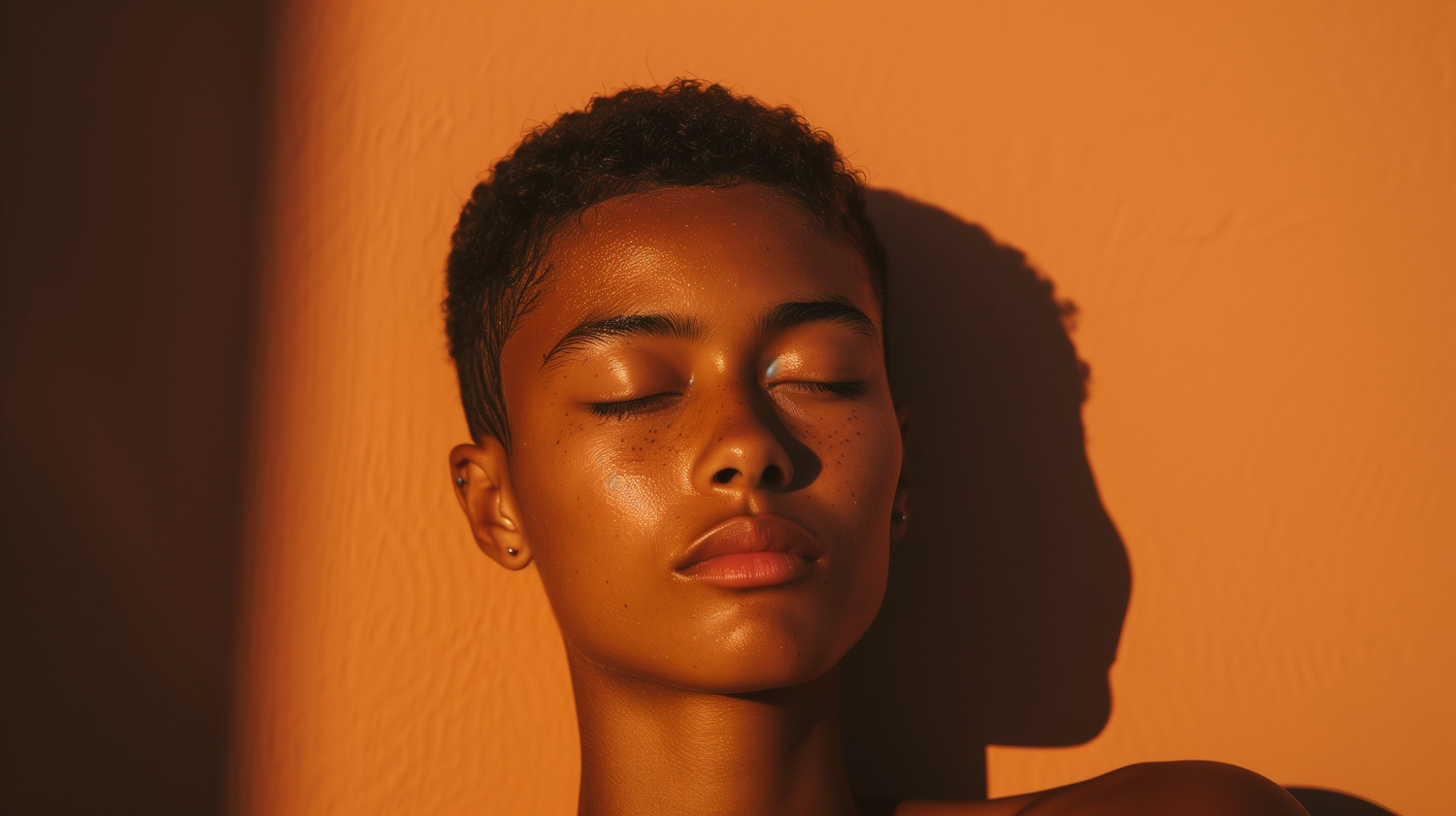 Serene portrait of a person with closed eyes, basking in warm sunlight against an orange background.