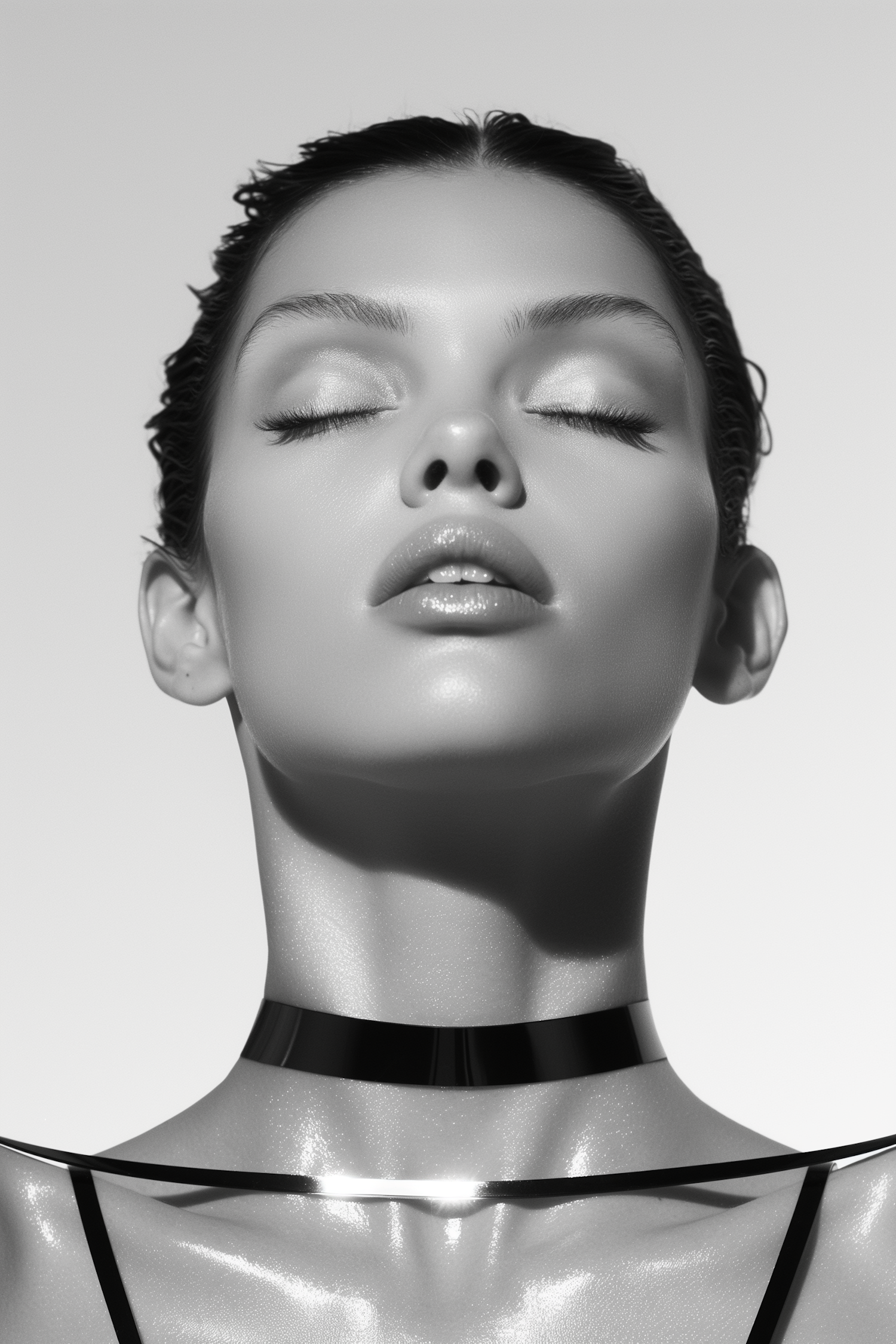 Elegant black and white portrait of a woman with closed eyes, wearing a glossy choker. Serene expression and smooth skin highlighted.