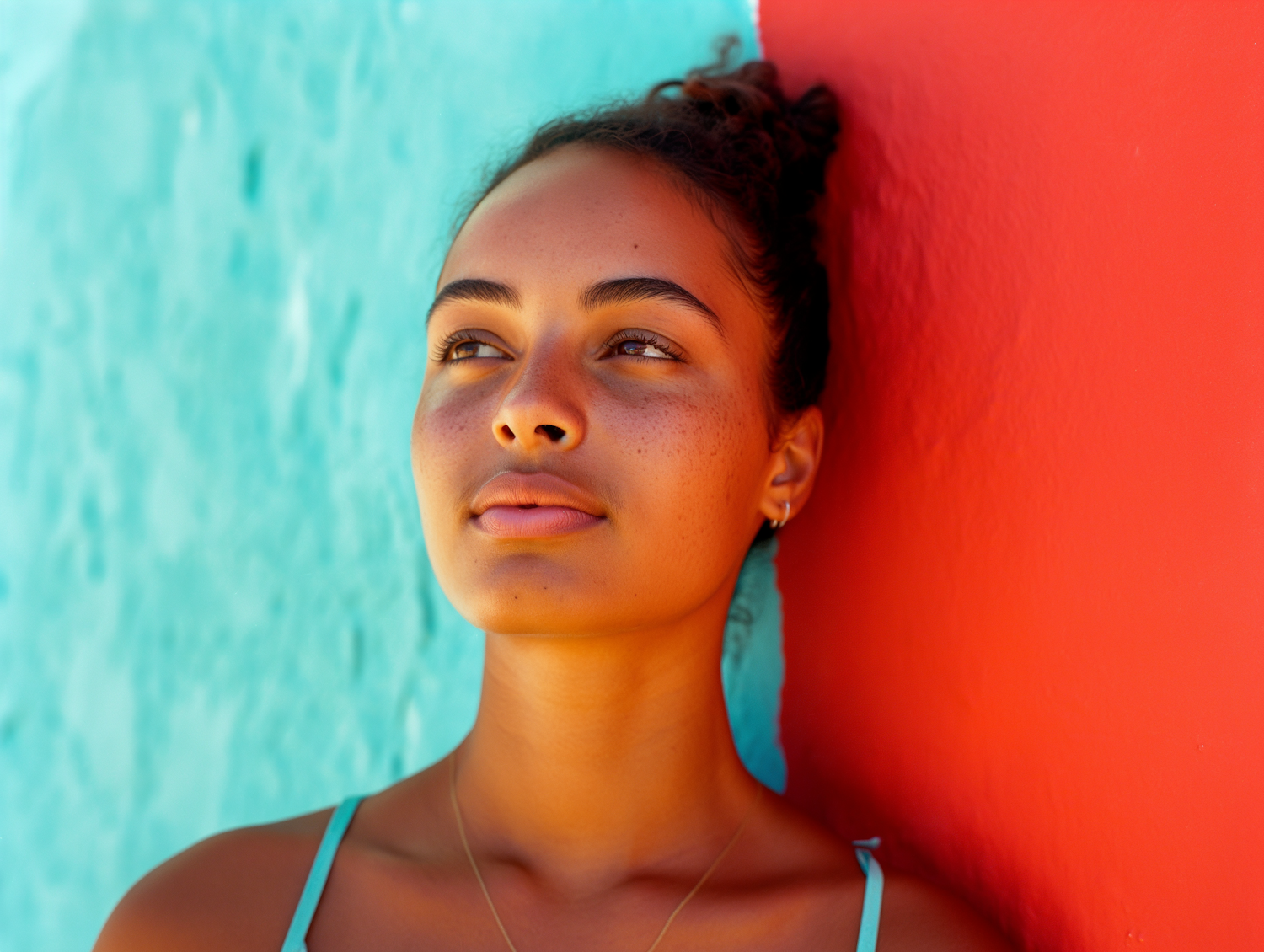Young woman with curly hair against a vibrant red and turquoise wall, wearing a light blue top. Serene expression, colorful contrast.