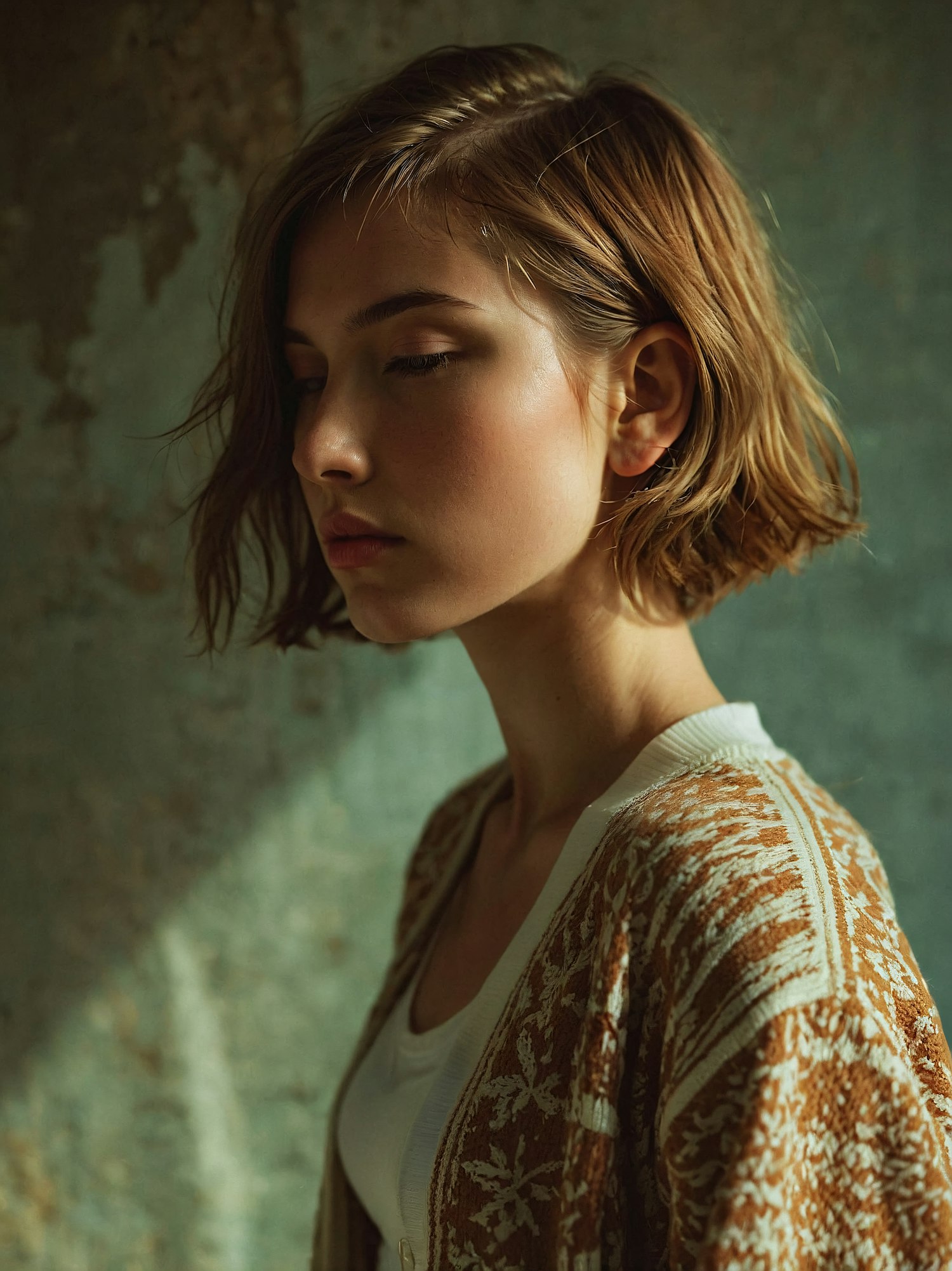 Serene portrait of a young woman with short hair in a patterned cardigan, set against a textured green background.