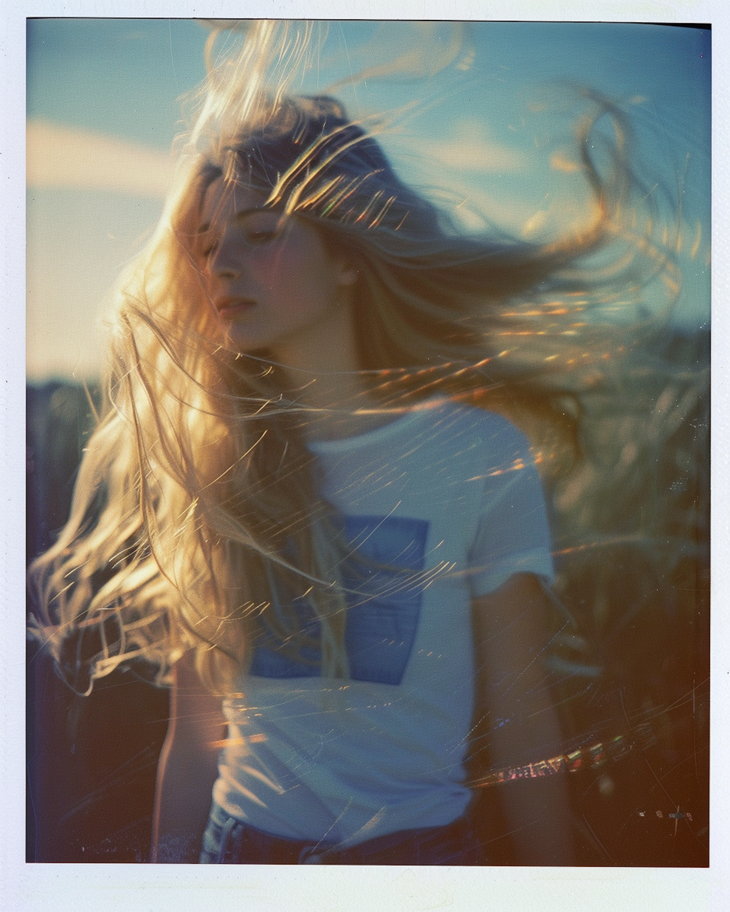Serene portrait of a young woman with flowing blonde hair in the sunlight, wearing a white t-shirt with a blue graphic.