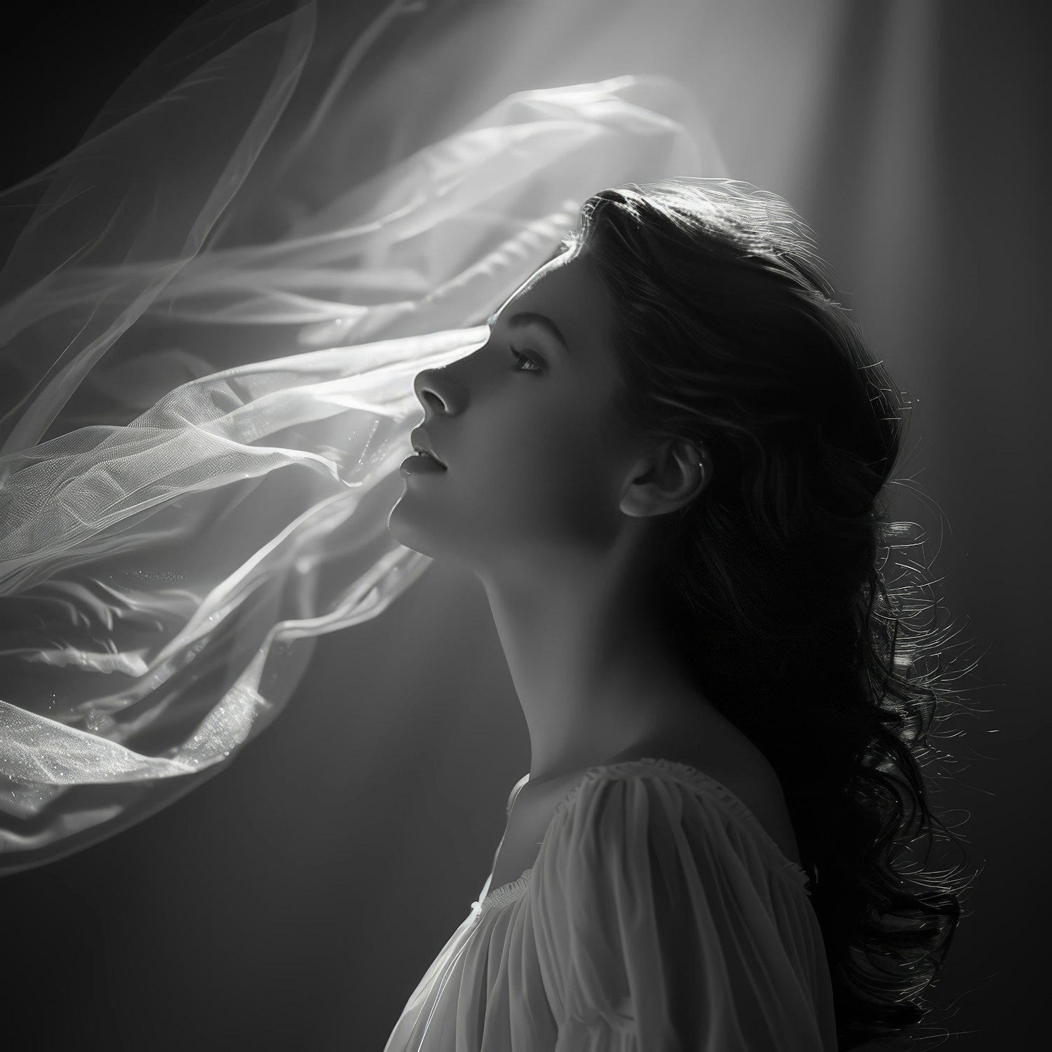 Ethereal black and white portrait of a woman with flowing hair and fabric, captured in dramatic lighting.