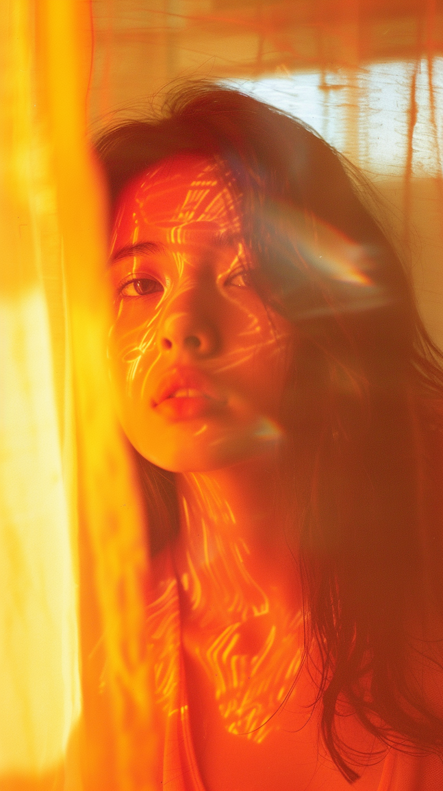 A serene portrait of a young woman in warm, golden light with intricate patterns on her face, creating a dreamy atmosphere.
