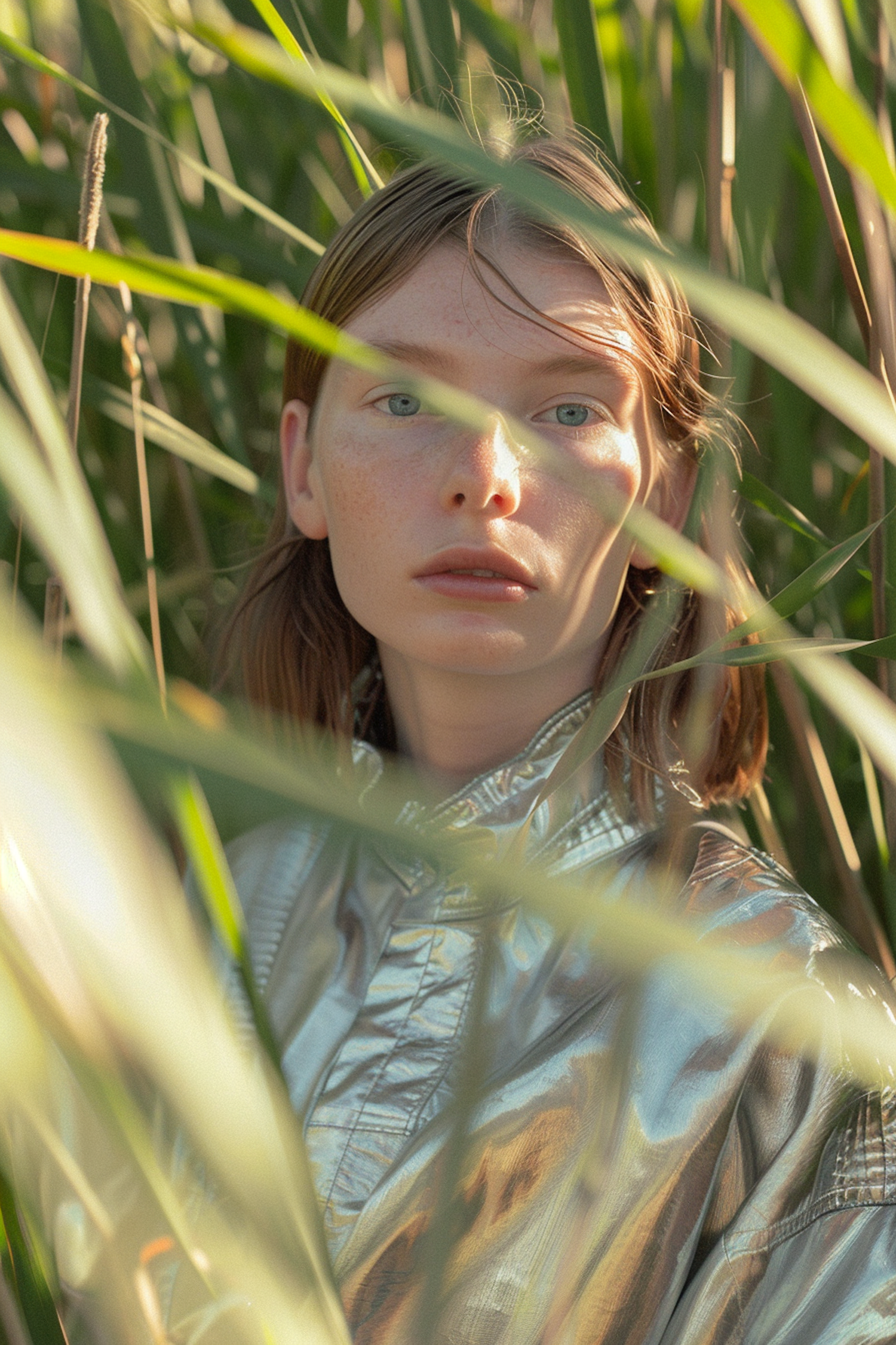 A young woman in a metallic jacket stands amidst tall grass, her light blue eyes and freckles highlighted by the sun.