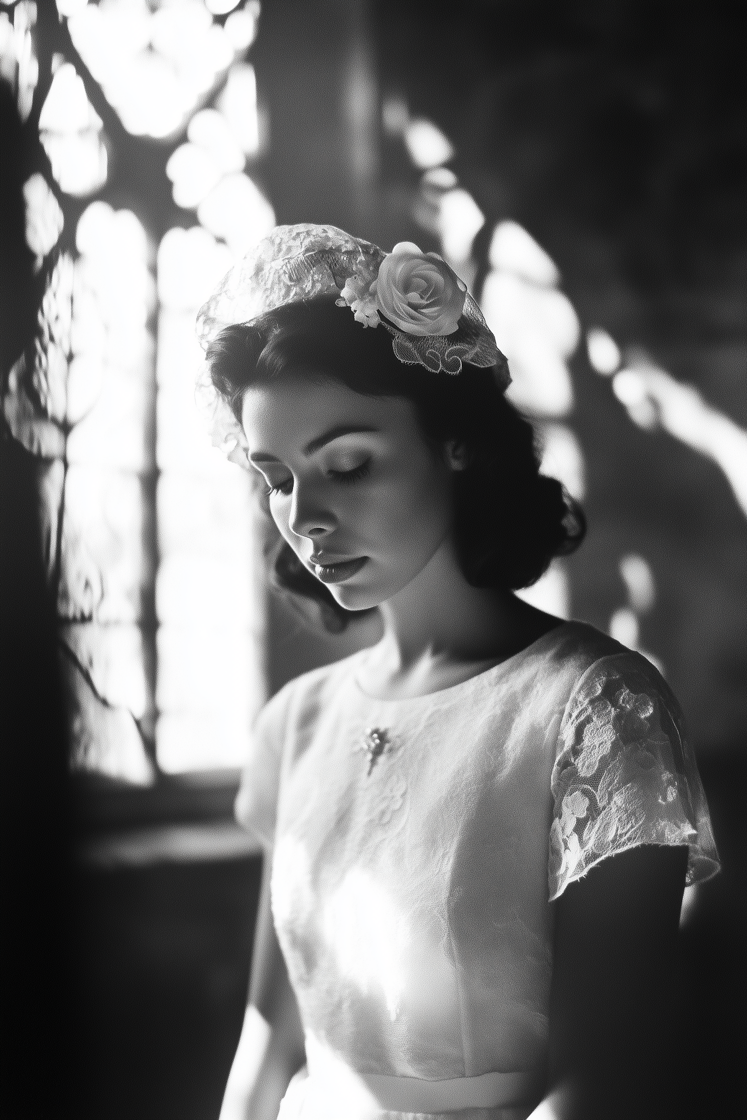 Elegant black and white portrait of a woman in lace, with soft lighting and serene expression, evoking timeless beauty.