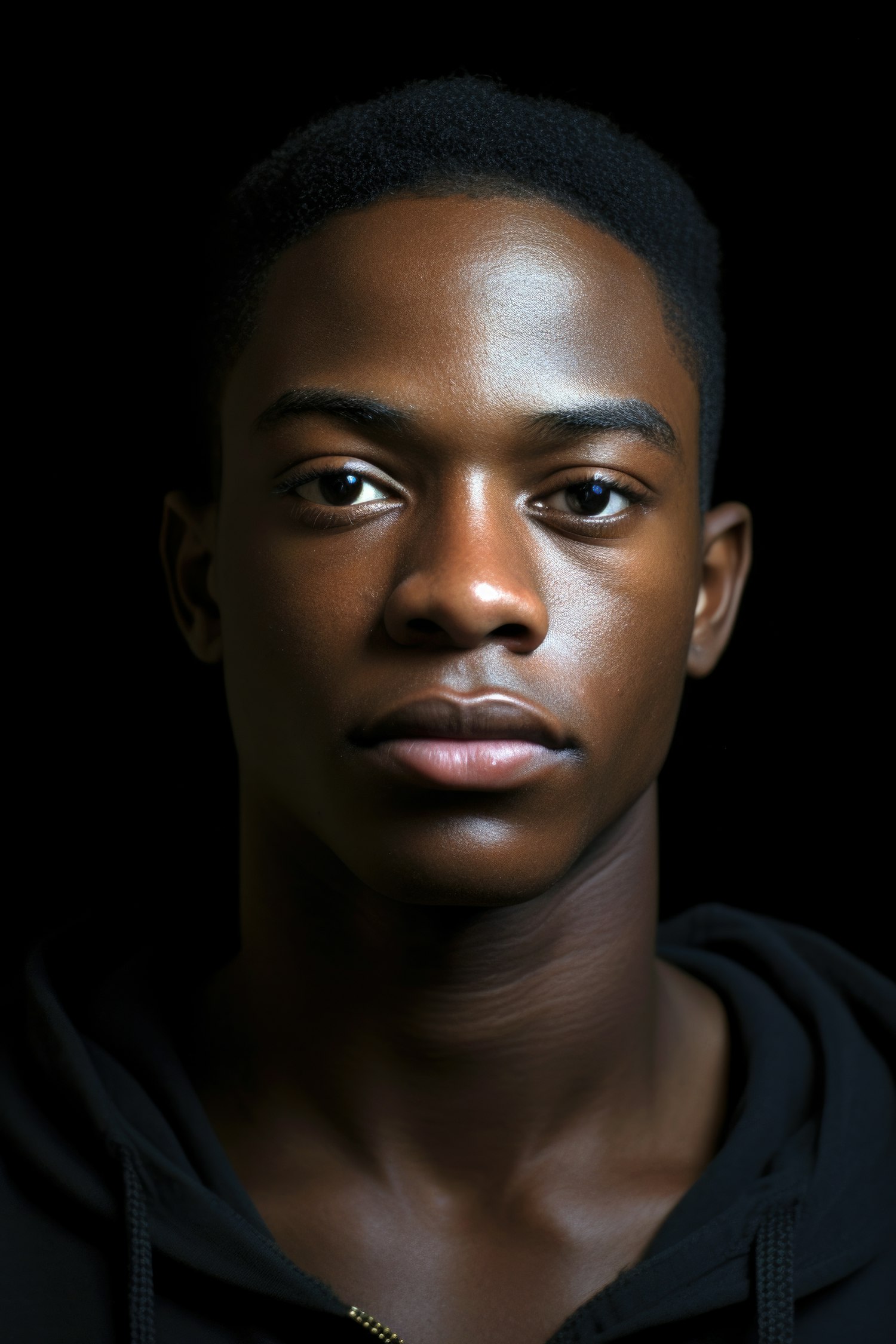 Portrait of a young Black man with dark skin and short hair, wearing a black hoodie against a dark background, exuding calmness.