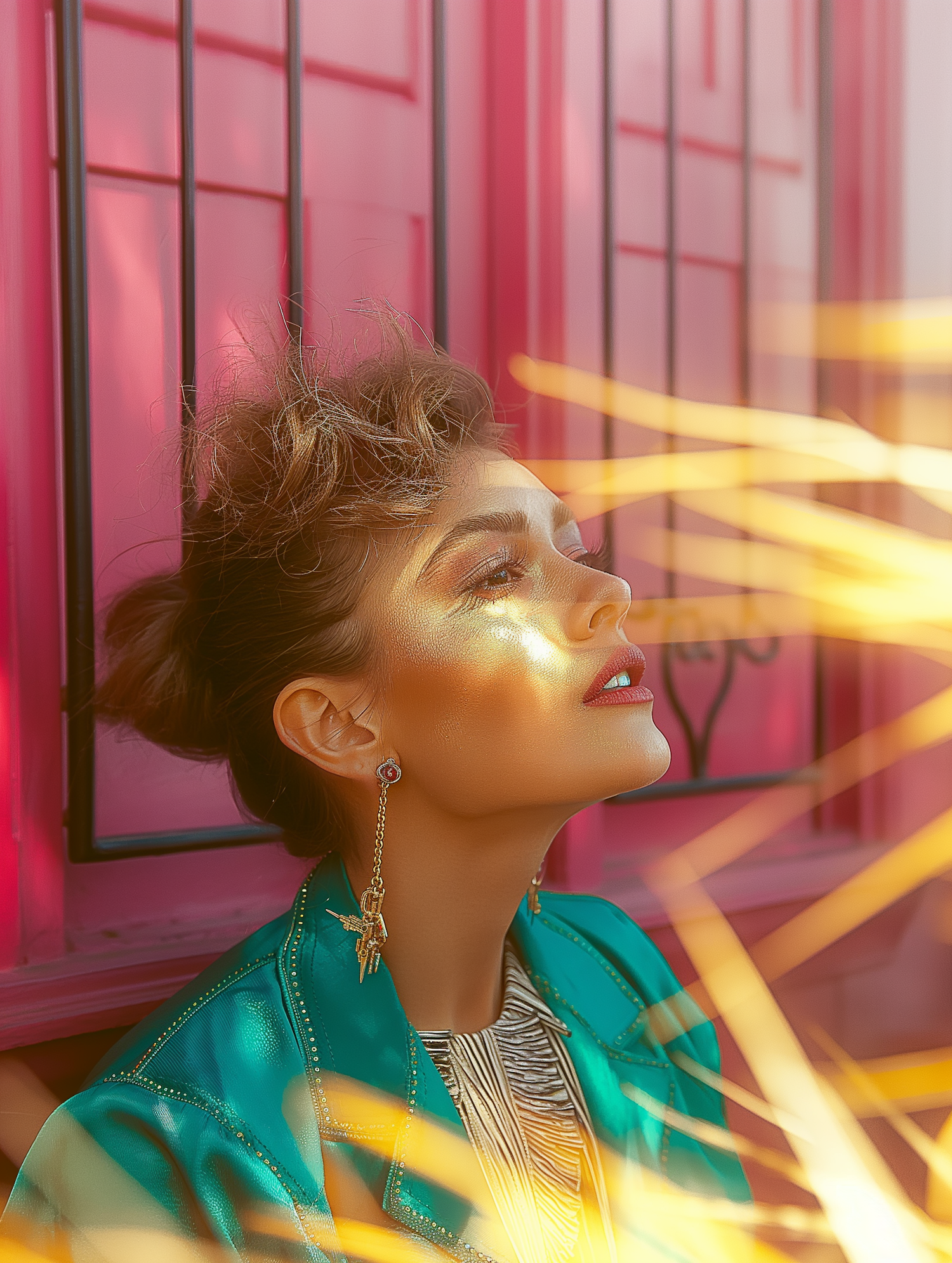 Woman in teal jacket with gold highlights and red lipstick against a pink wall, sunlight casting golden streaks.
