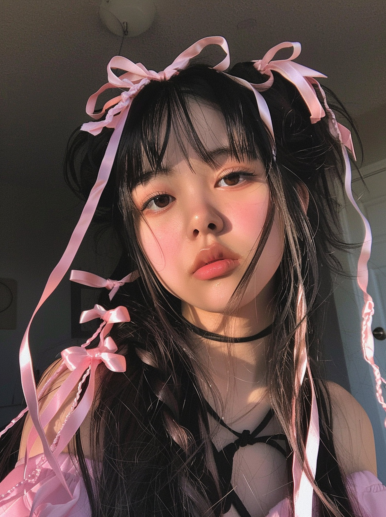 Young woman with pink ribbon-adorned hair, soft makeup, and a black choker, bathed in warm light for a serene portrait.