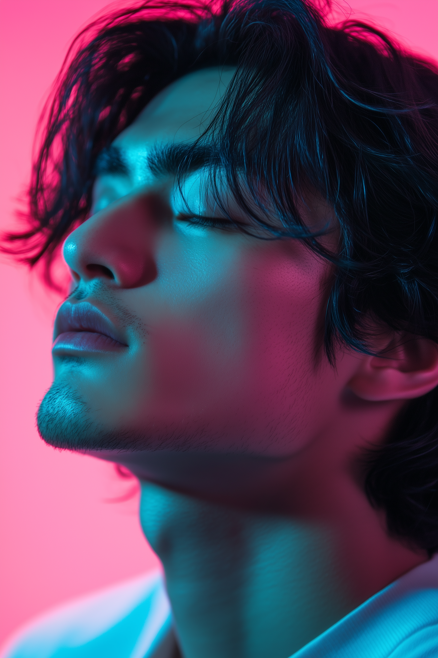 Close-up of a serene young man with dramatic pink and blue lighting, highlighting his features against a vibrant background.