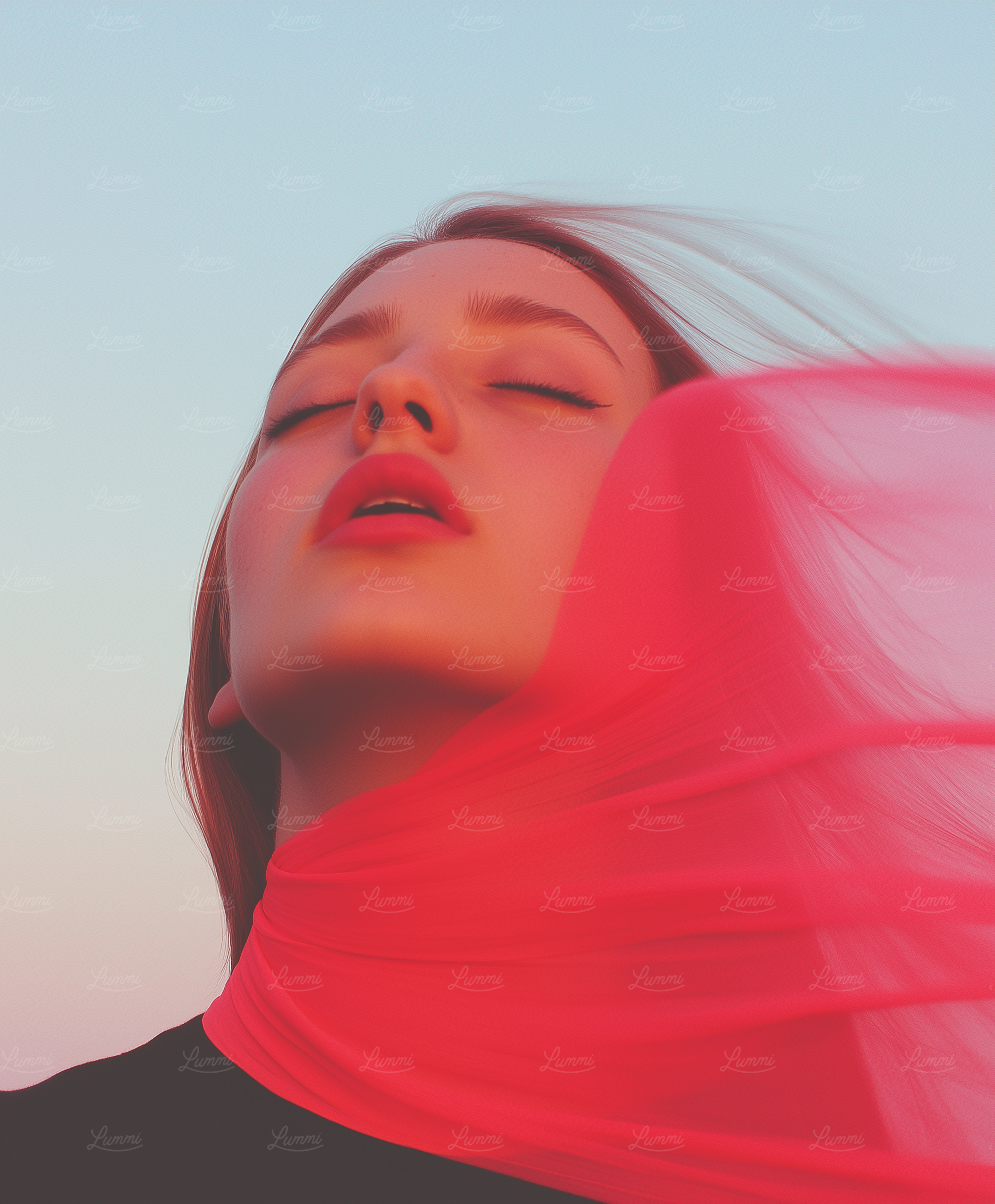 Serene portrait of a woman with a flowing red scarf against a pastel sky, capturing a moment of calm and introspection.