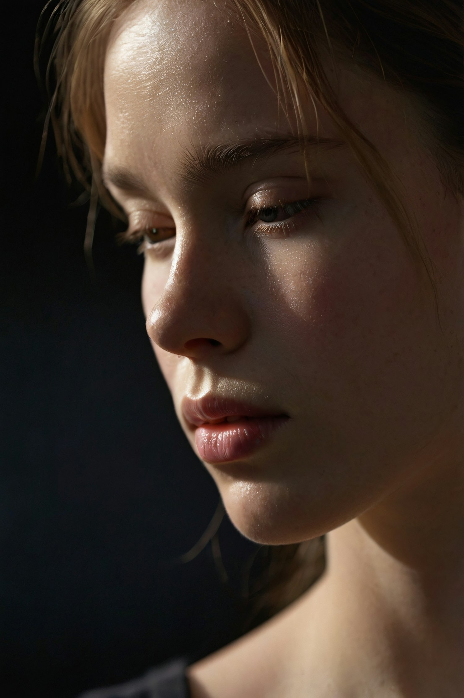 Close-up portrait of a young woman with fair skin and light brown hair, in soft lighting and a contemplative expression.
