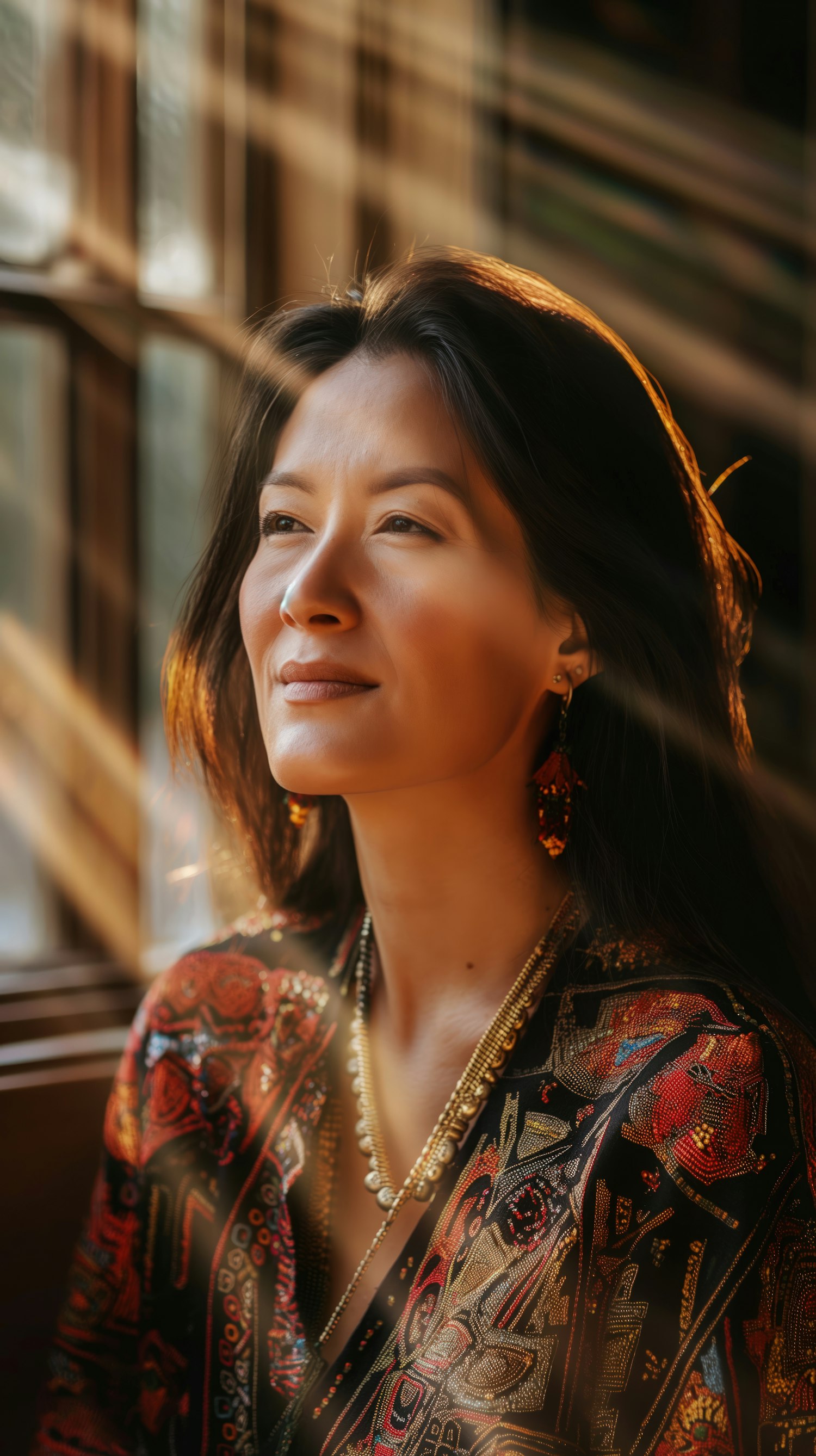 A serene woman in warm sunlight, wearing intricate gold jewelry and a colorful patterned garment, gazes thoughtfully out a window.