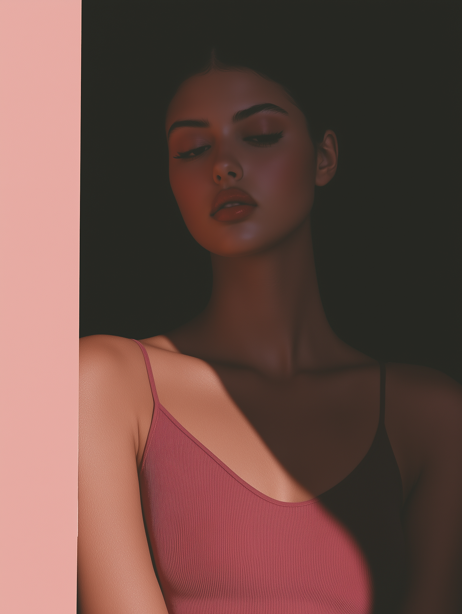 A serene woman in a muted red top stands against a dark background, softly illuminated, creating a dramatic and minimalist composition.