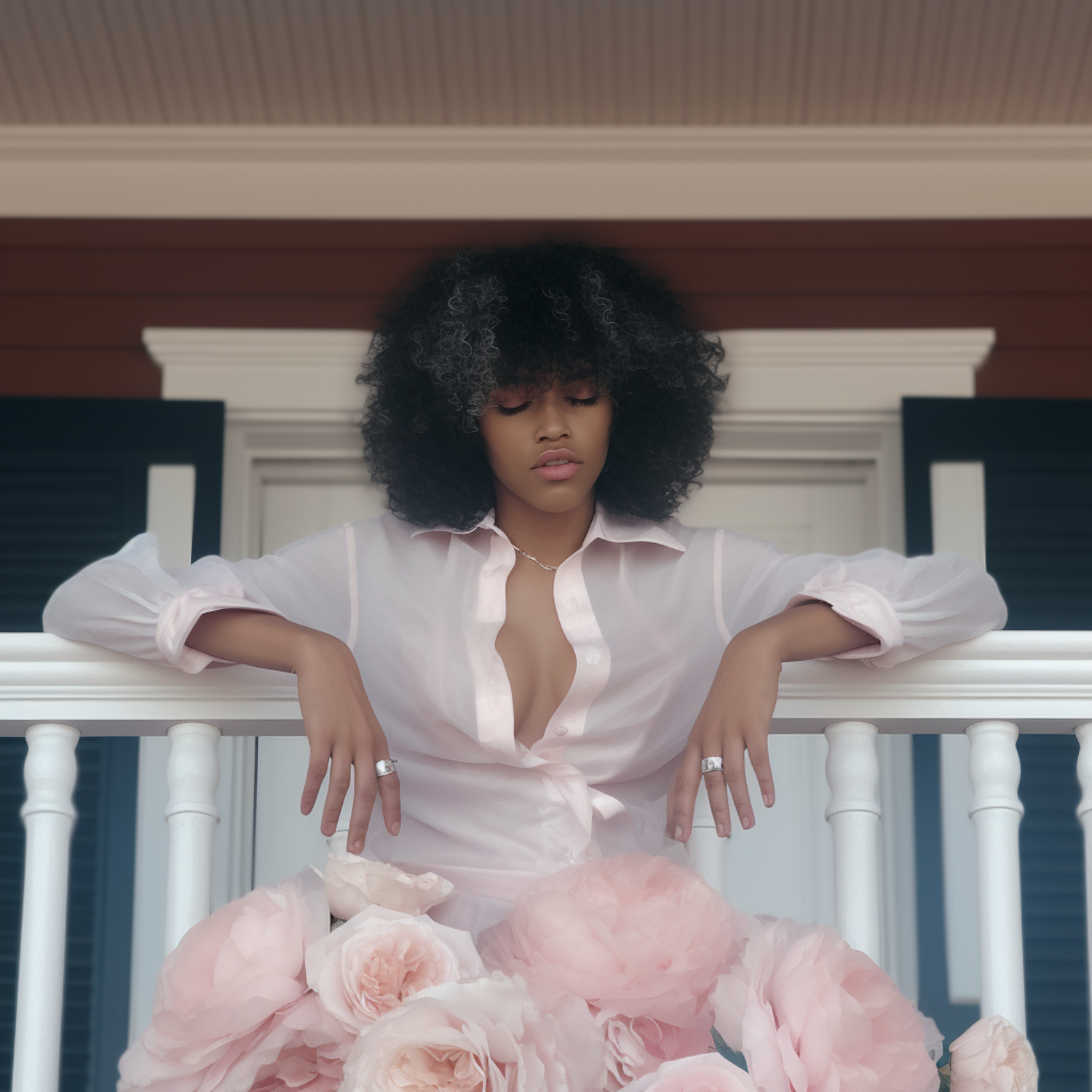 Serene woman with curly hair in a sheer blouse, surrounded by pink flowers on a porch, exuding elegance and tranquility.