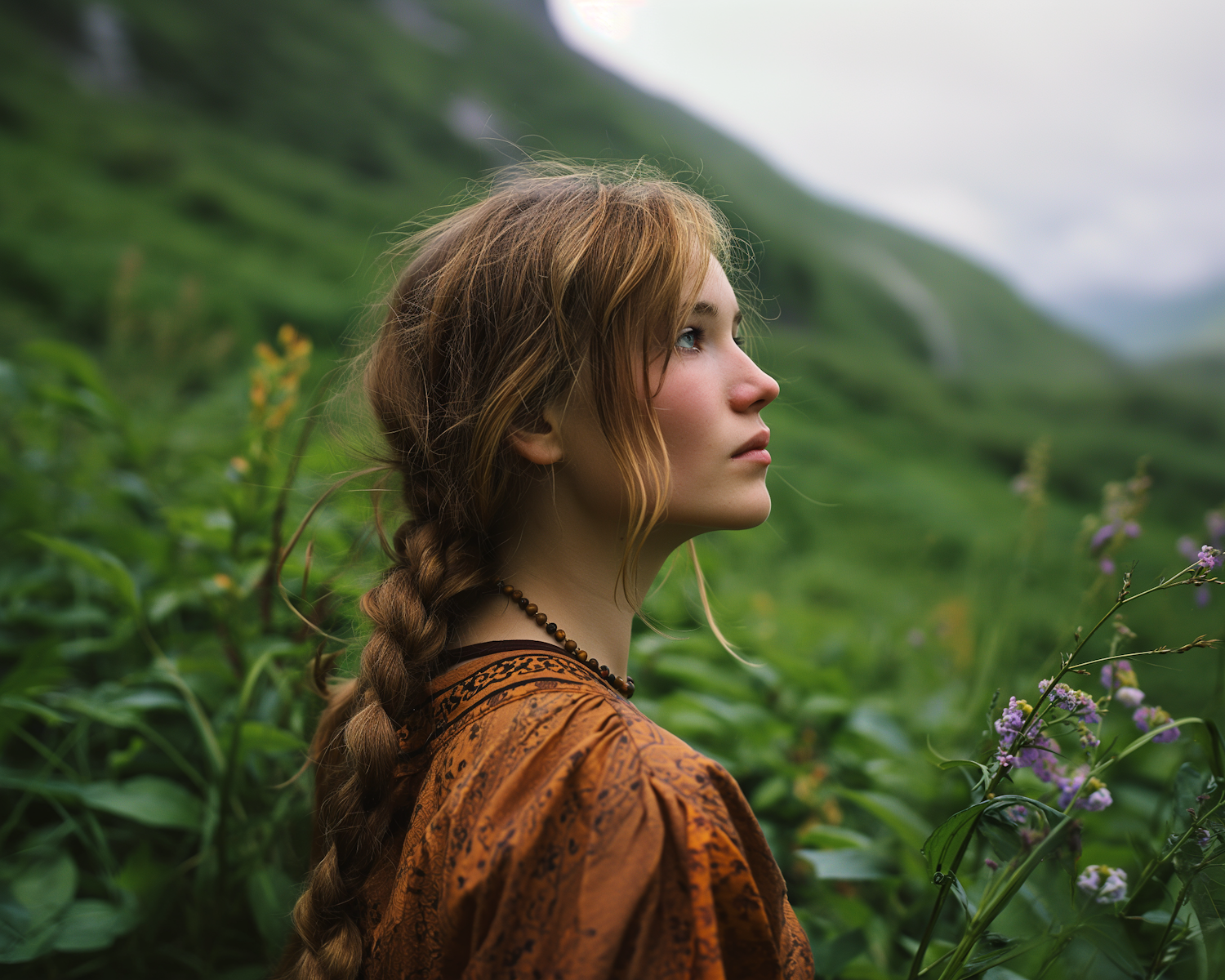 Young woman with braided hair in a lush green landscape, wearing a brown blouse and beaded necklace, gazing thoughtfully into the distance.
