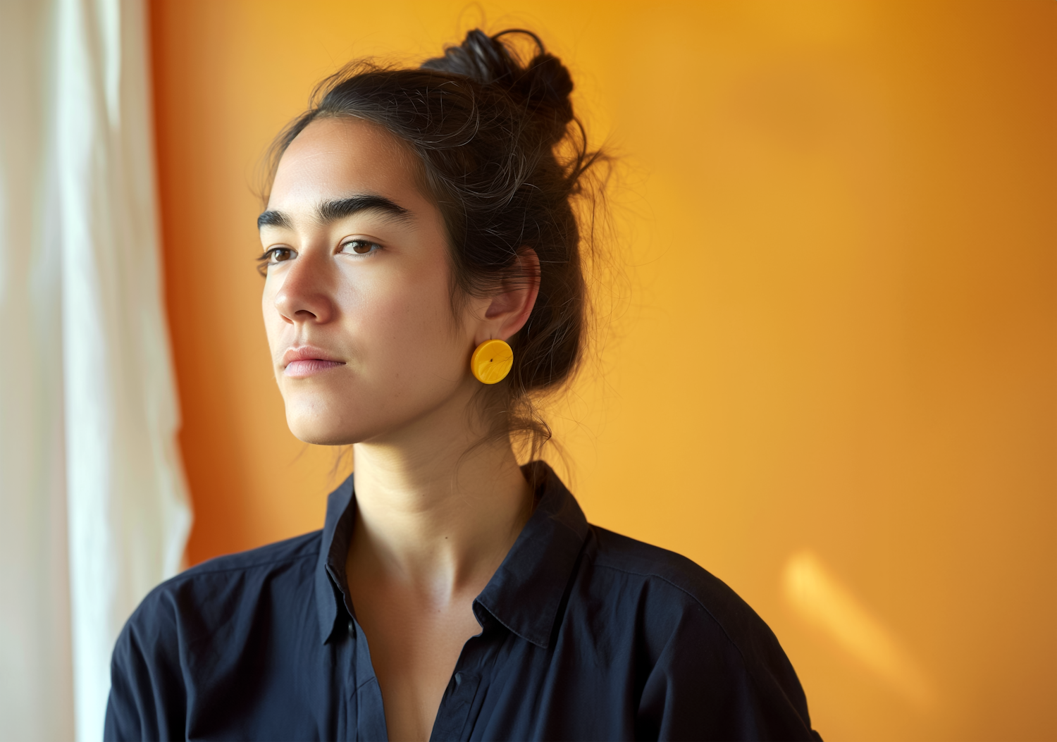 Portrait of a woman with dark hair in a bun, wearing yellow earrings and a navy shirt, set against a vibrant orange background.